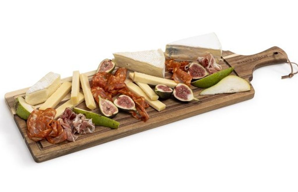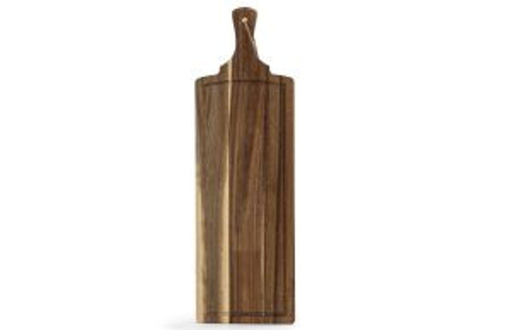 Stor och stilfull plockbricka i oljad acacia, perfekt för servering av ost och snittar. Mått: 63x20x1,5 cm.
