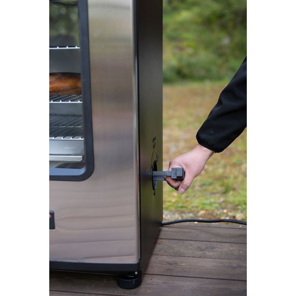 Med digital manöverpanel, justerbar temperatur mellan 38–137 °C, samt tidsinställning upp till 24 timmar, har du full kontroll över rökningen. Den borstade ståldörren med fönster ger en modern känsla samtidigt som du enkelt följer tillagningsprocessen.