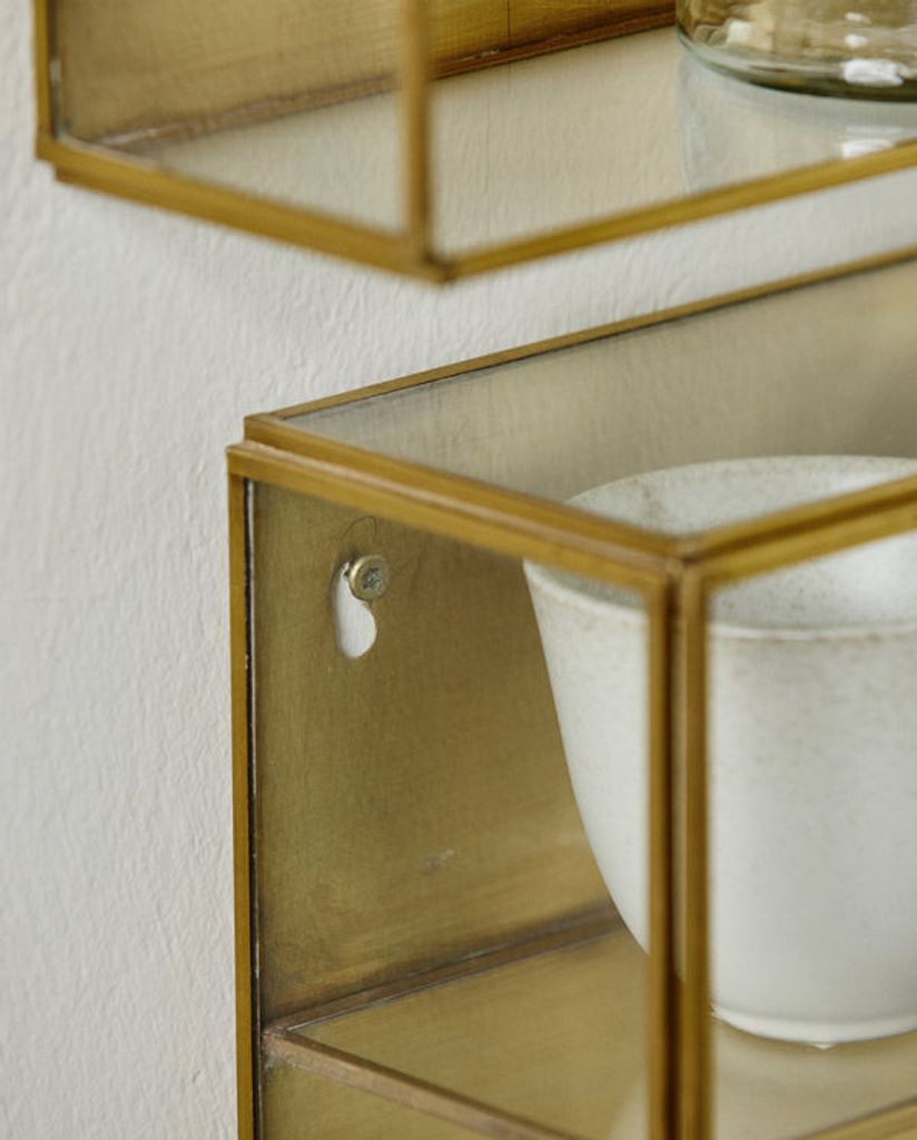Upptäck elegansen i Nordal ADA Väggskåp, designat för att hängas på väggen och optimera din förvaring. Med en gyllen yta och fyra praktiska hyllor, ger detta skåp både funktion och stil till ditt hem. Perfekt för att visa upp dekorativa föremål eller förvara vardagsföremål.