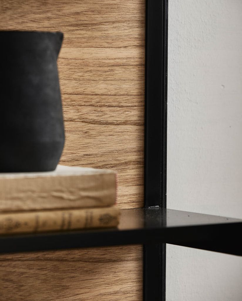 Skåpet har en baksida i trä som tillför värme och textur till designen, medan de inre hyllplanen i MDF ger gott om utrymme för att visa upp eller förvara dina ägodelar. Det medföljer två robusta trästänger för säker väggmontering, vilket gör denna möbel både praktisk och stilfull.