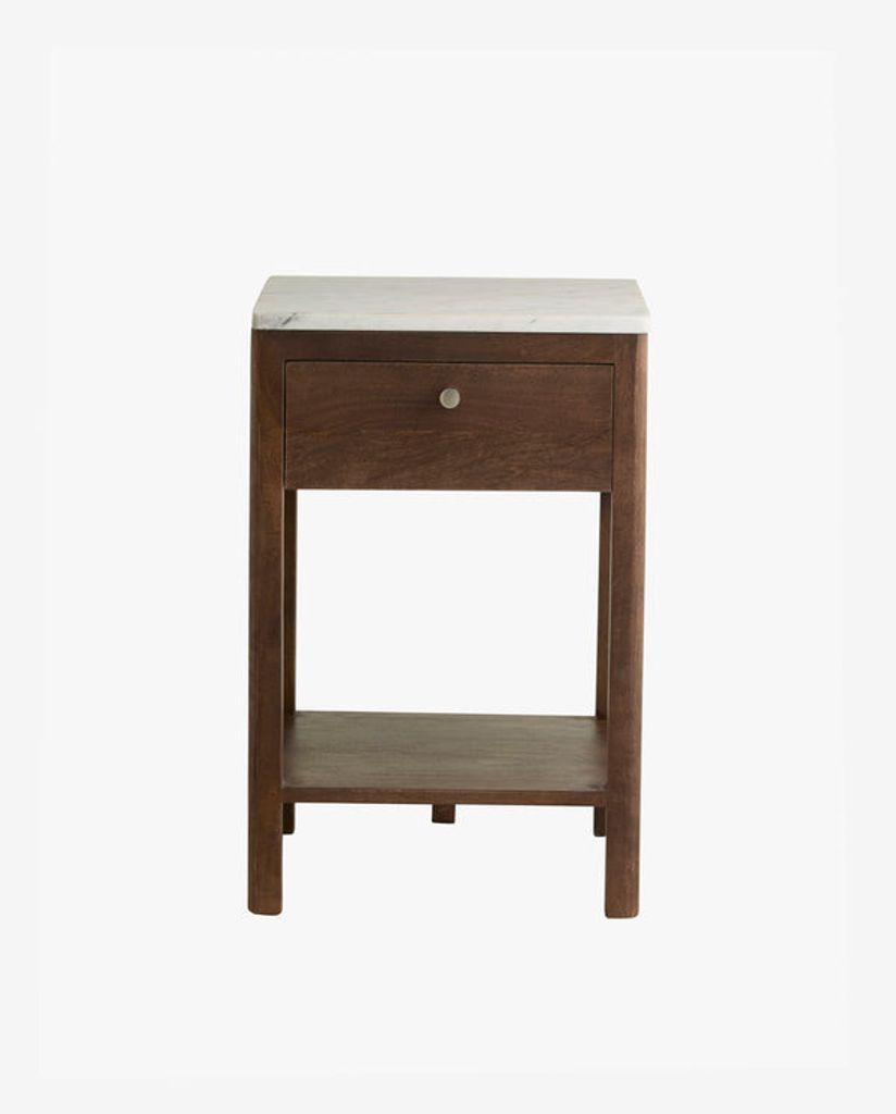 Elegant nattduksbord i mangoträ med marmorskiva och mässingsdetaljer – perfekt för stilren förvaring.