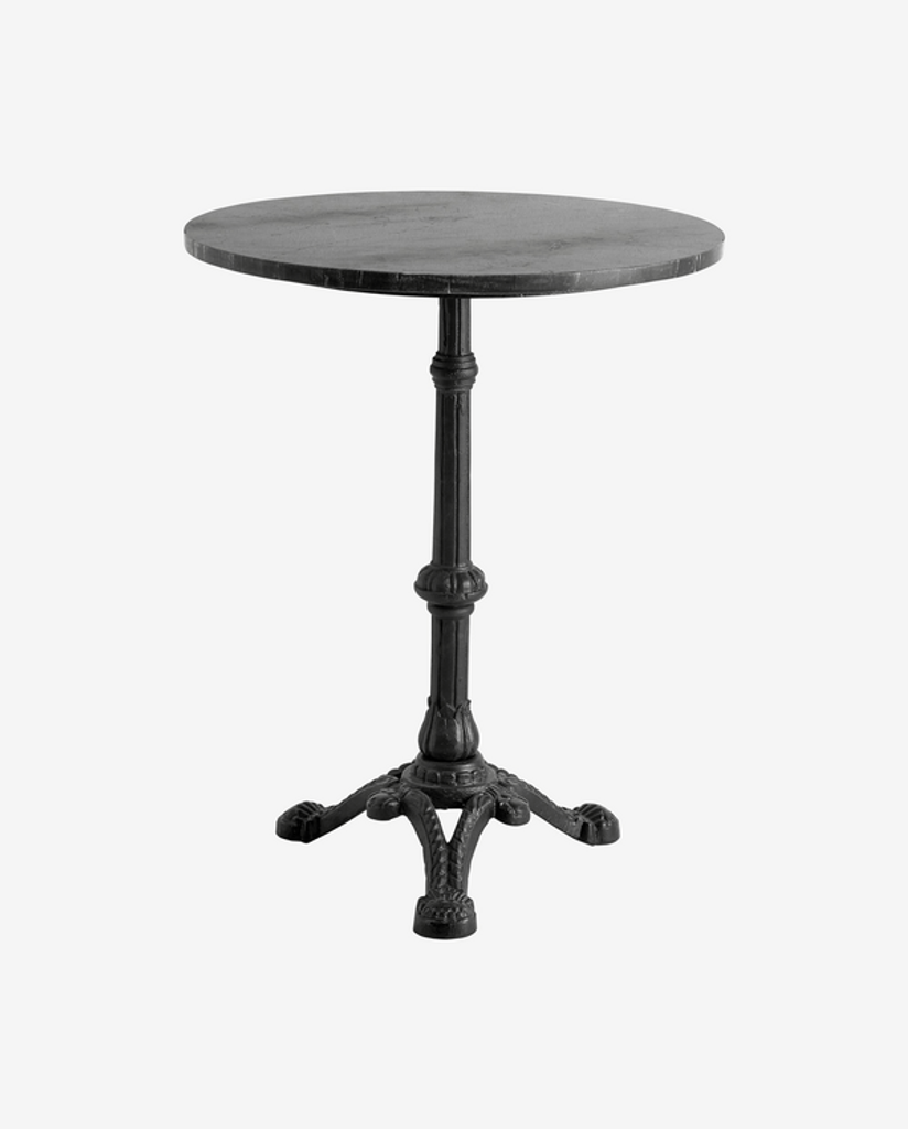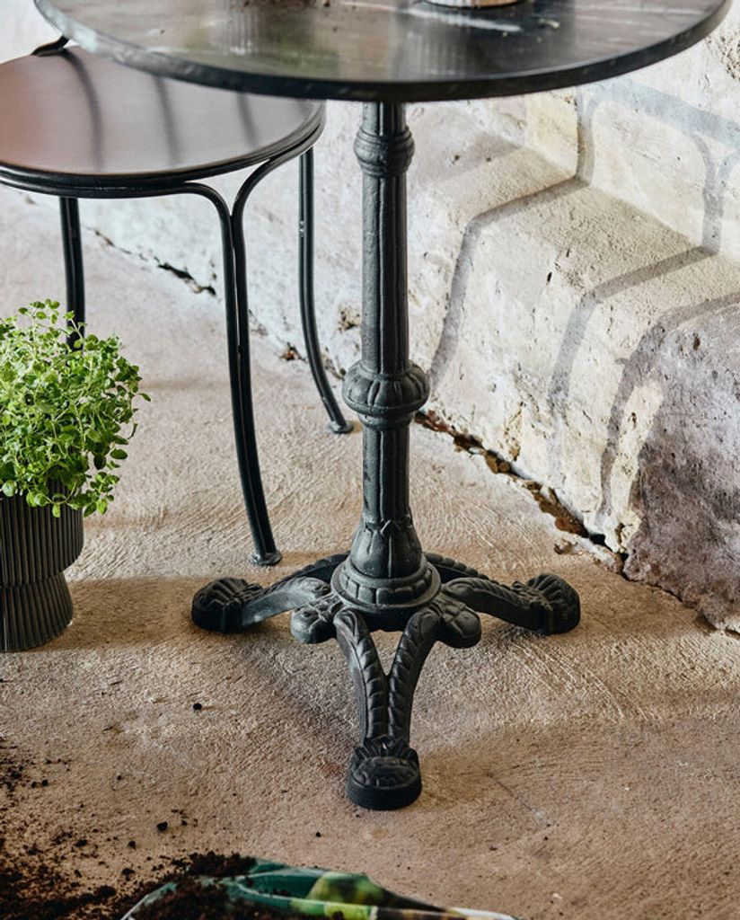 Elegant cafébord med svart marmorskiva och robusta järnben. Perfekt för både inomhus- och utomhusbruk.