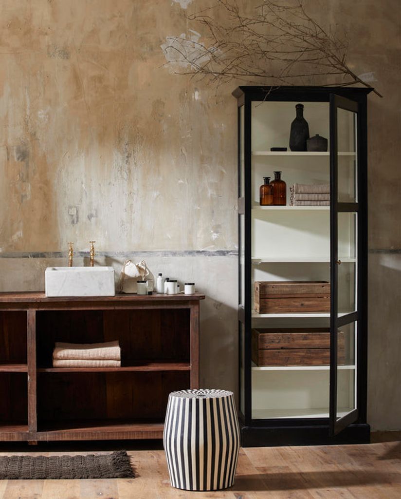 Skåpet är tillverkat av FLEGT-certifierat trä från Indonesien och har en robust konstruktion av mahogny, mango och plywood som ger en hållbar produkt med en exklusiv känsla. De stora glaspartierna framhäver innehållet samtidigt som de skapar en känsla av rymd.