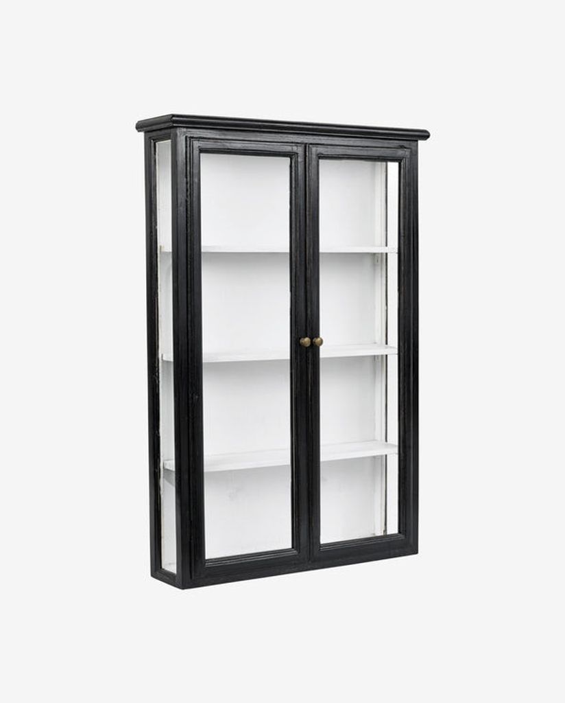 Detta eleganta väggskåp från Nordal kombinerar tidlös design med praktisk funktionalitet. Med sin svarta ram och glasdörrar erbjuder skåpet en stilren lösning för förvaring och display av dina favoritföremål. Skåpet är delvis handgjort, vilket innebär att varje exemplar är unikt med sina naturliga variationer i färg och finish.