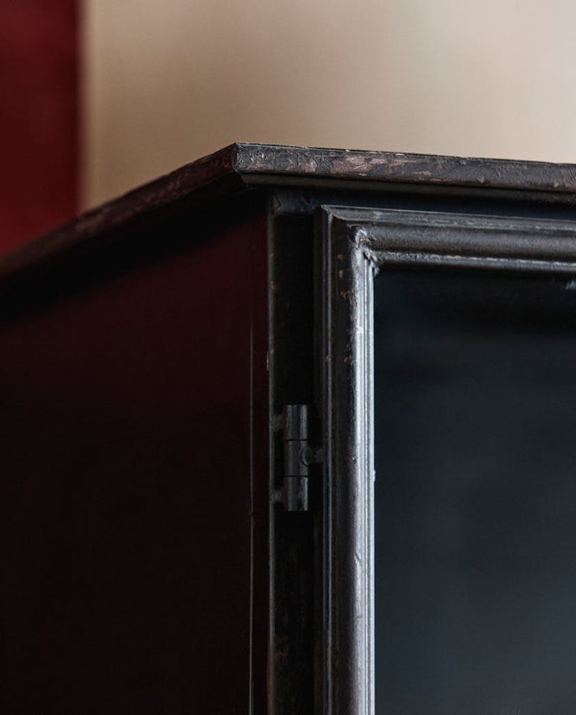De två dörrarna är försedda med stilrena handtag och glasrutor som ger en lyxig inblick i skåpets innehåll. Detta skåp är inte bara funktionellt, utan också en visuell höjdpunkt med sina detaljerade smidesjärnsdelar och sofistikerade finish.