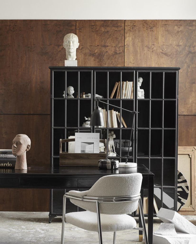 Skåpet är tillverkat av slitstarkt järn och har härdat glas som ger en känsla av öppenhet samtidigt som det skyddar innehållet. Med en antik finish som ger ett speciellt och unikt utseende, blir denna möbel både praktisk och dekorativ. Den handgjorda finishen innebär att varje skåp är unikt, med subtila variationer i färg och struktur.