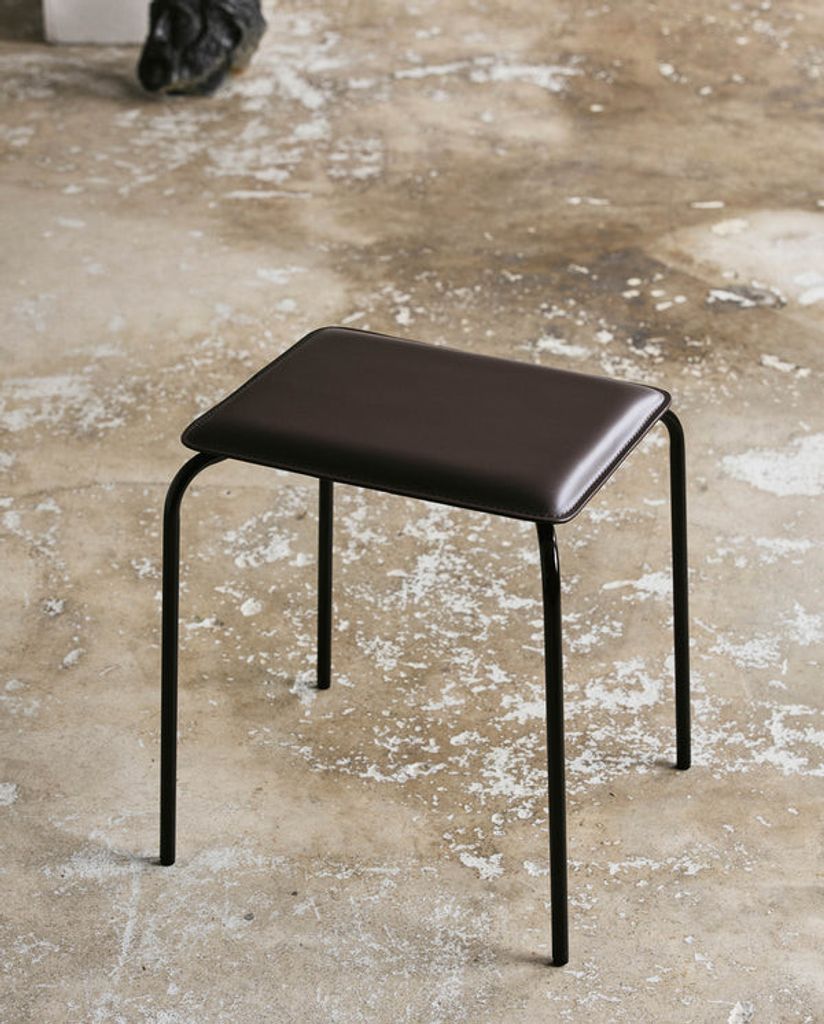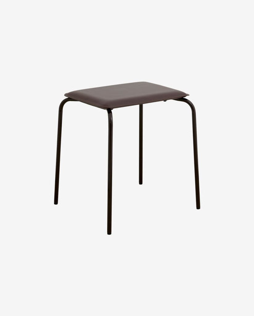 Upptäck ESA pallen, en stapelbar och tidlös design med metallram och brun PU-lädersits. Perfekt som extra sittplats eller bord.
