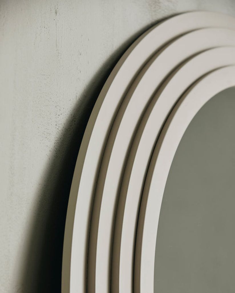 Elegant spegel i sandfärgad järnram med enkel väggmontering. Perfekt för modern inredning.