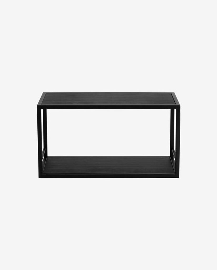 Elegant hylla med två trähyllor i svart järnram. Lätt att montera med inkluderade skruvar.
