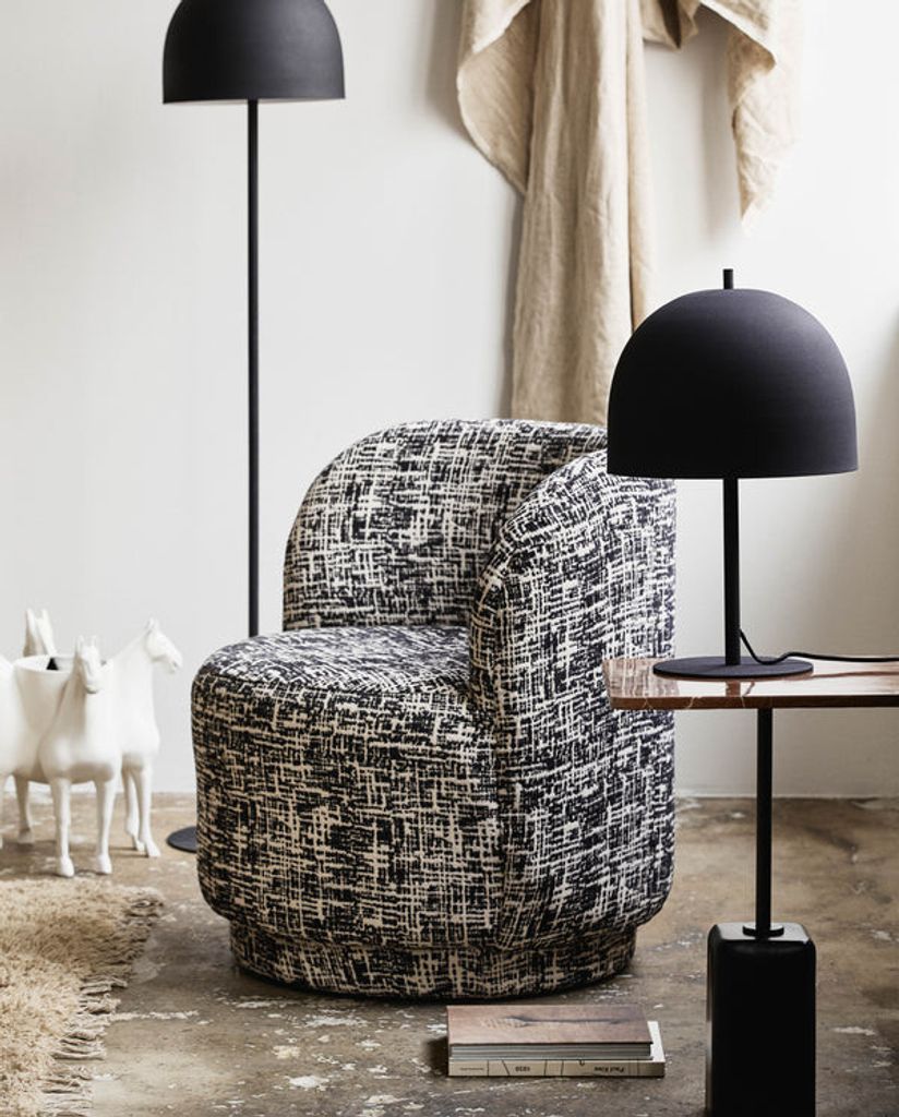 Elegant bordslampa i mattsvart järn med vit insida och 2,5 m tygsladd. Perfekt för stilfull belysning.