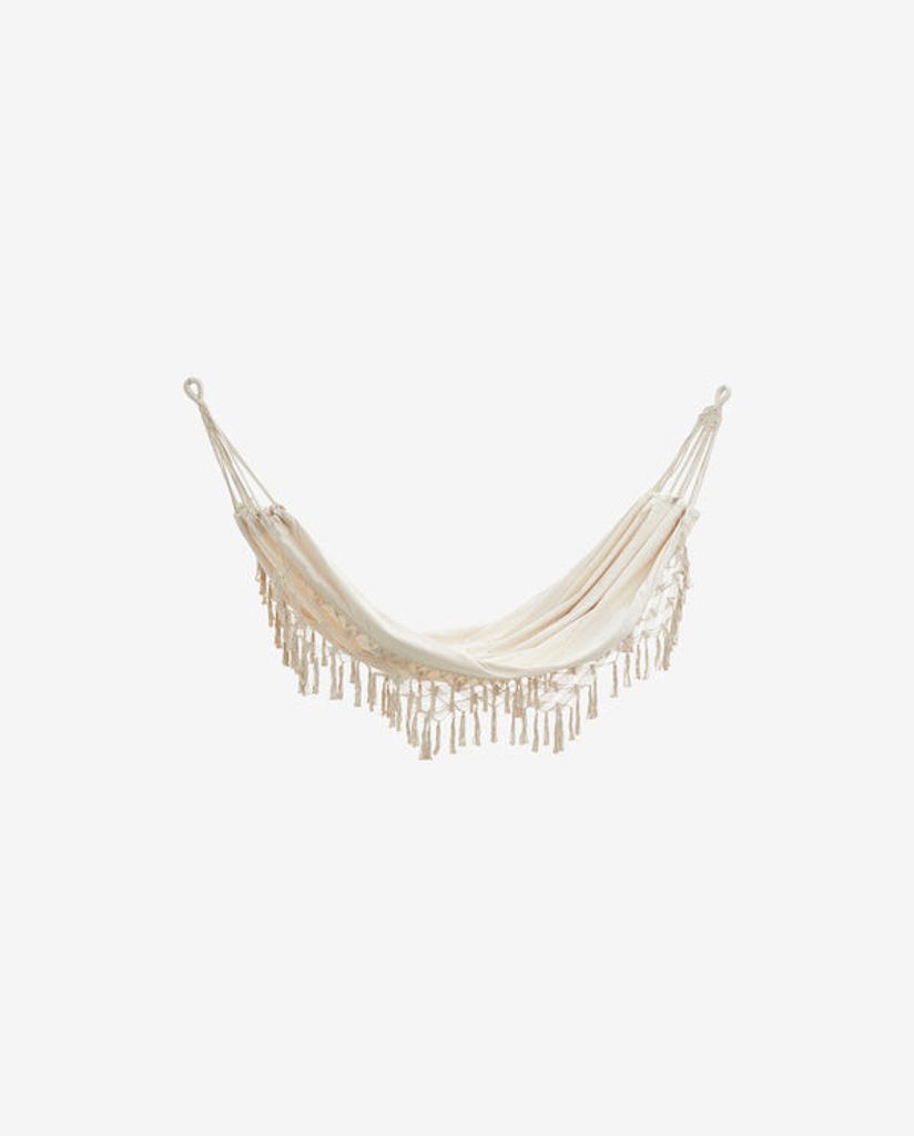 Vacker cremefärgad hängmatta med virkad detalj, perfekt för avkoppling inomhus eller i trädgården.