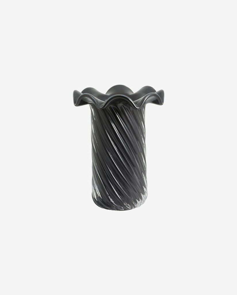 Elegant och tidlös vas i grått glas med vågig kant och vriden form. Perfekt både med och utan blommor.
