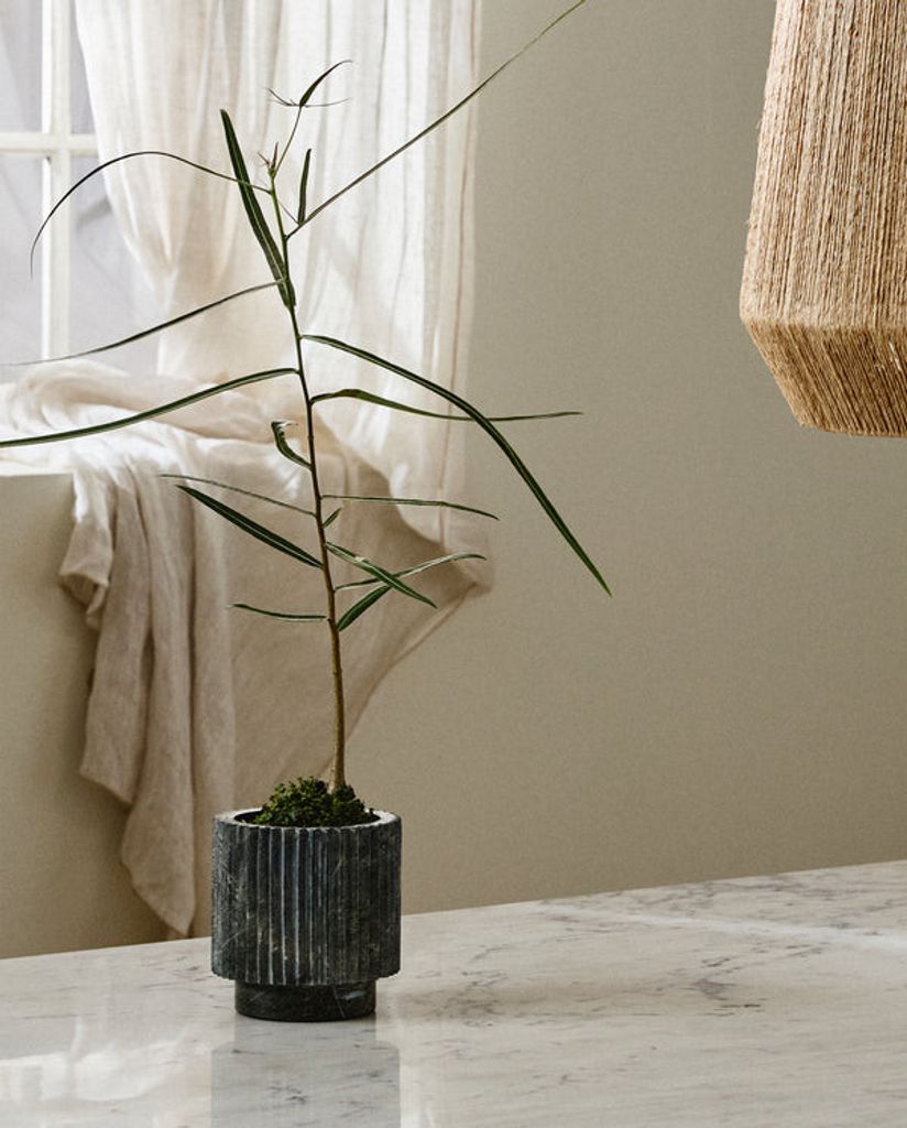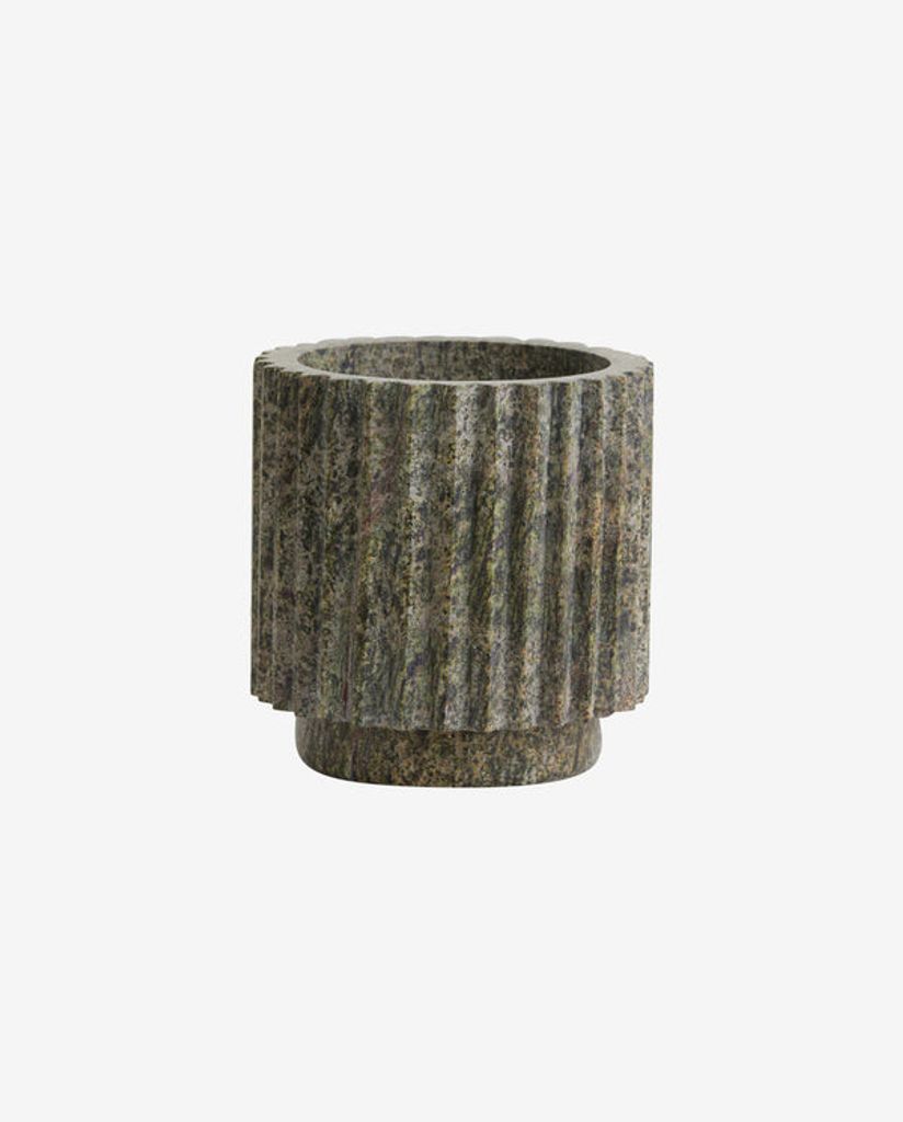 Stilren och dekorativ kruka i grön marmor med unik struktur och färgvariation.