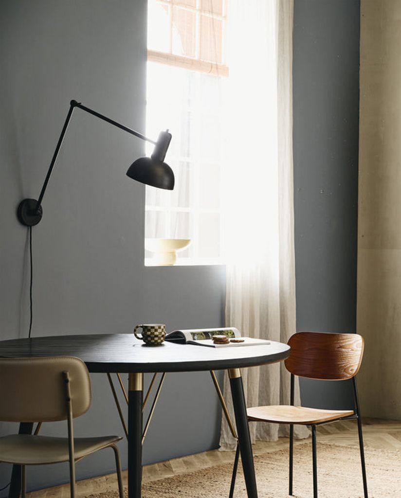 Elegant runt matbord i FSC-certifierat svart trä med gulddetaljer och unika handgjorda variationer.