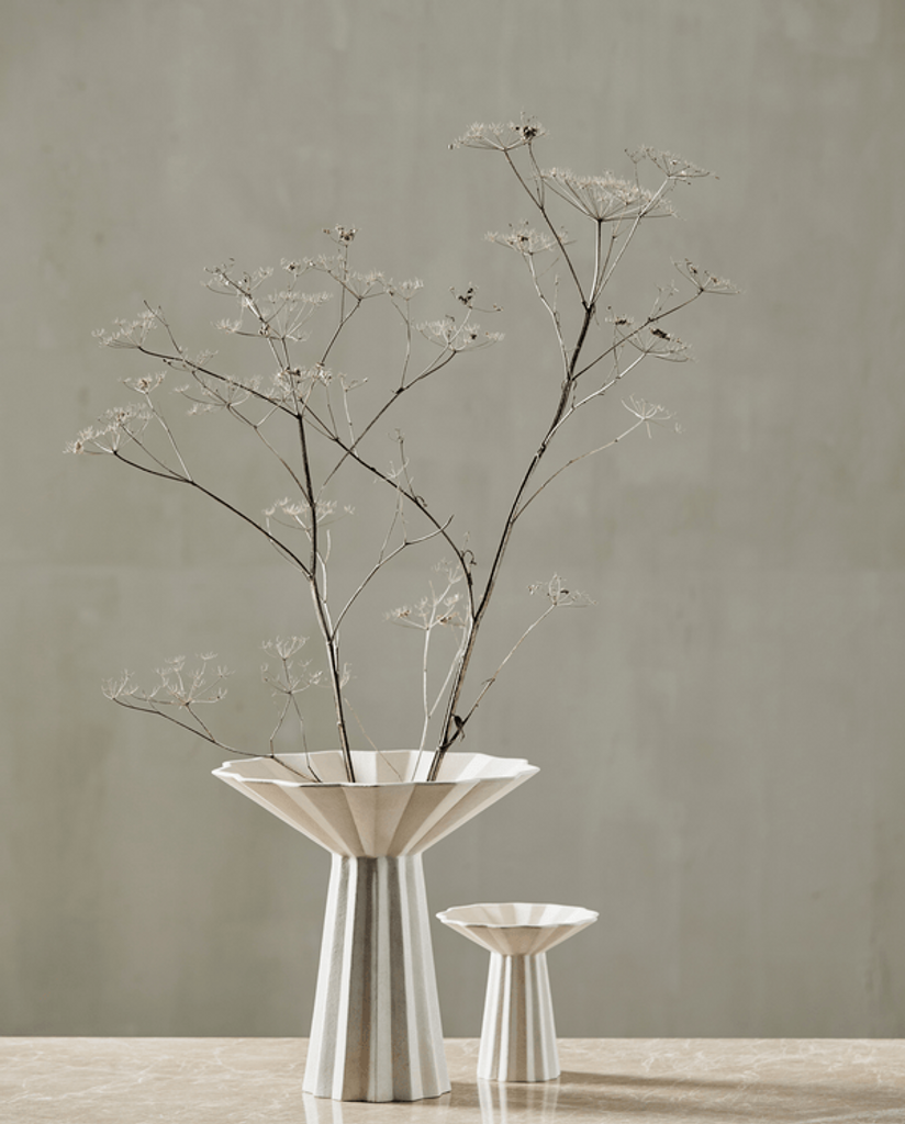 Nordal MINU vas, L - Elfenben är en perfekt kombination av elegans och funktion. Tillverkad av högkvalitativt stengods med en vacker ribbad textur, är denna vas både hållbar och estetiskt tilltalande. Dess design, som öppnar sig upptill likt en solfjäder, gör den till ett slående inslag i vilket rum som helst. Vasen är idealisk för att visa upp en vacker bukett, eller som ett fristående skulpturalt inslag.