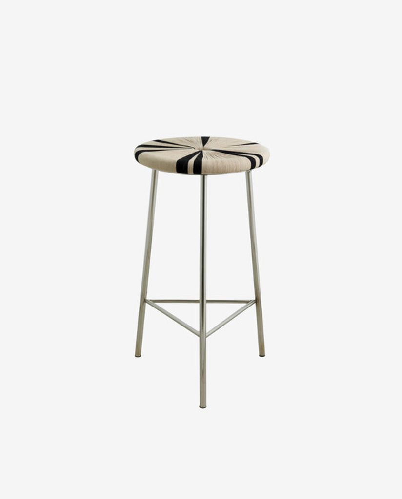 Nordal MORICE pall erbjuder en unik kombination av rå elegans och modern design. Den kromade ramen i kombination med den handvävda sitsen i svart och elfenben skapar ett distinkt och dynamiskt mönster. Denna pall är perfekt för att tillföra en varm, industriell touch till ditt hem.