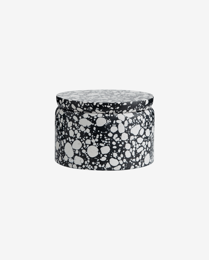 Elegant förvaringsburk i svart och vit terrazzo. Perfekt för att organisera små föremål i hemmet.