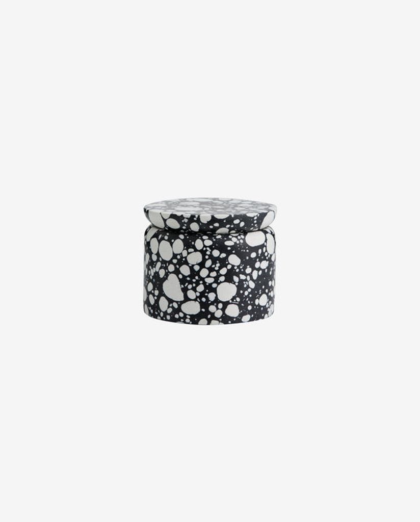 Upptäck den Nordal MULES förvaringsburk, som kombinerar funktion med en tidlös design. Dess distinkta svartvita terrazzo-mönster ger burken ett unikt och stilfullt uttryck som enkelt kan förhöja atmosfären i vilket rum som helst. Perfekt för kontoret, badrummet eller vardagsrummet, där små föremål enkelt kan organiseras och stuvas undan.