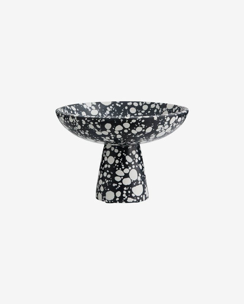 Den skulpturala Nordal NUSA-skålen i svart och vit terrazzo är en elegant tillsats till varje inredning. Dess unika mönster, där svart och vit terrazzo blandas harmoniskt, gör varje skål unik. Den cylindriska basen ger en stabil upphöjning som framhäver skålens design.