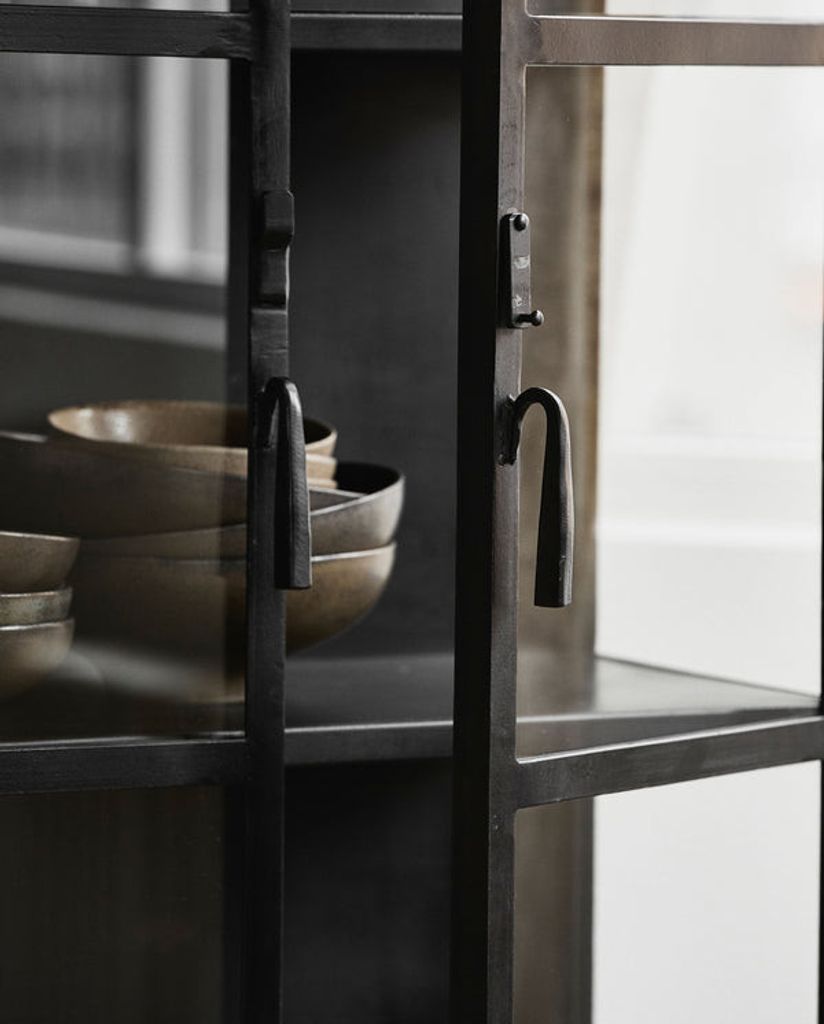 Klassiskt svart järnskåp med glasdörrar, fyra hyllor, perfekt för en industriell inredning.