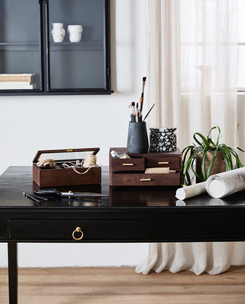 PUYO förvaringslåda i betsat mangoträ med glaslock och mässingshandtag. Perfekt för organisering av småsaker.
