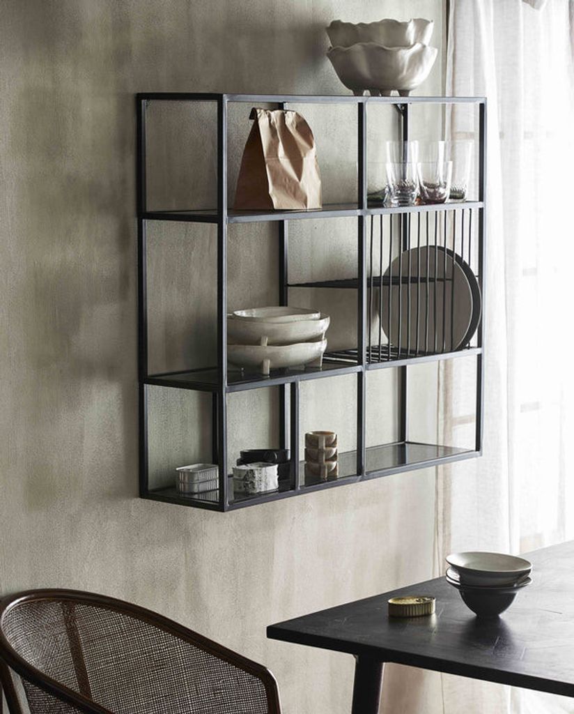 Elegant och funktionell svart hylla i järn och glas, perfekt för köksförvaring.