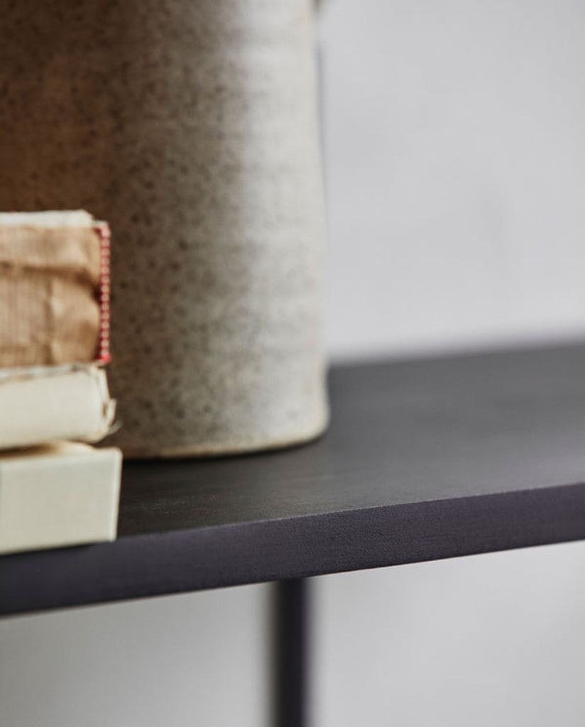 Minimalistisk och funktionell TANO hylla i svart trä med metallbeslag. Perfekt för både dekor och förvaring.
