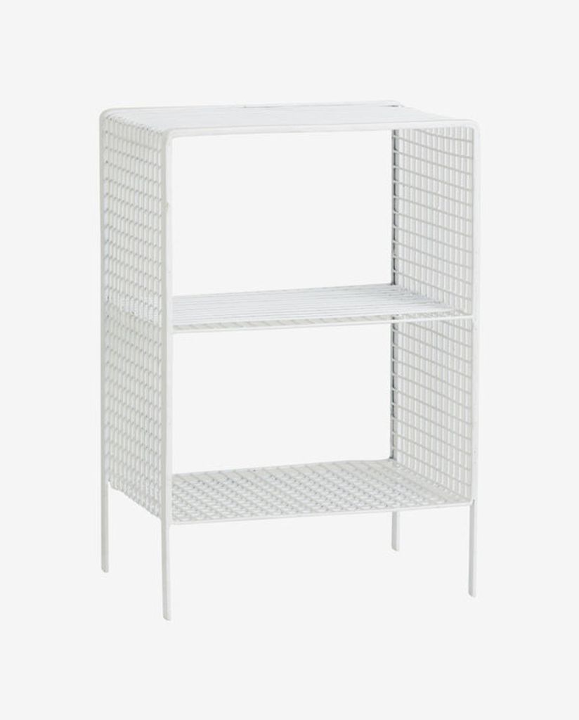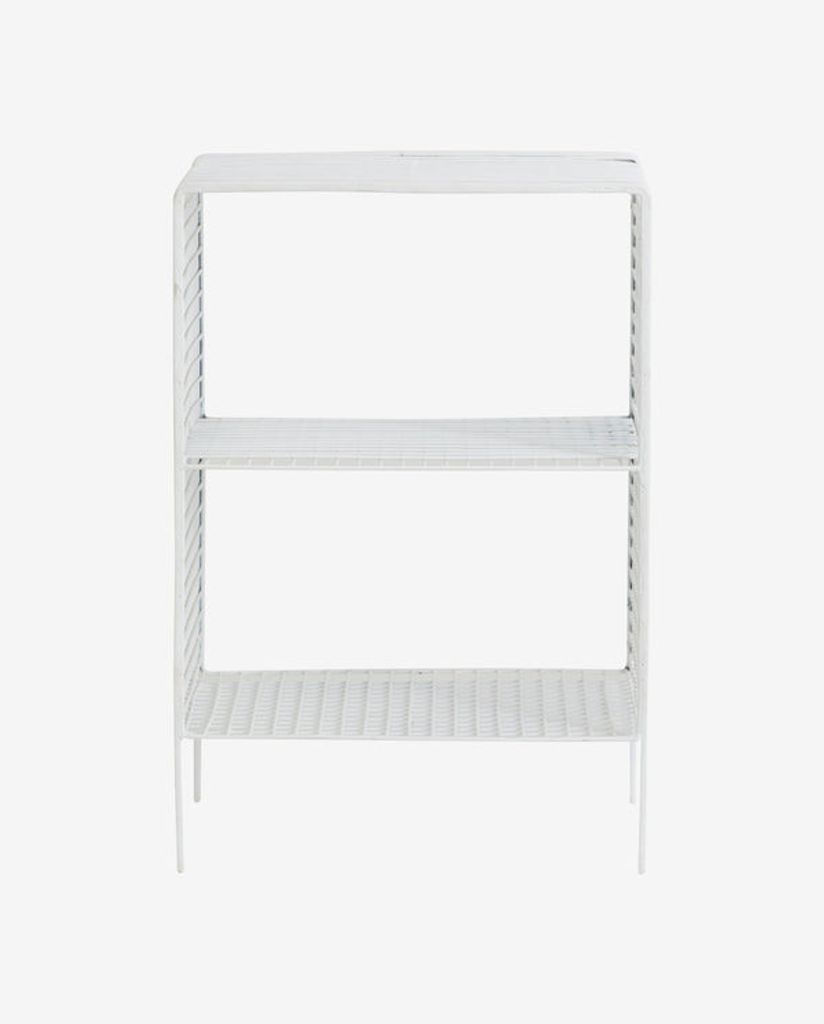 Elegant och mångsidig TUO hylla i vitmålad metall med järngaller, perfekt som sängbord eller förvaring.