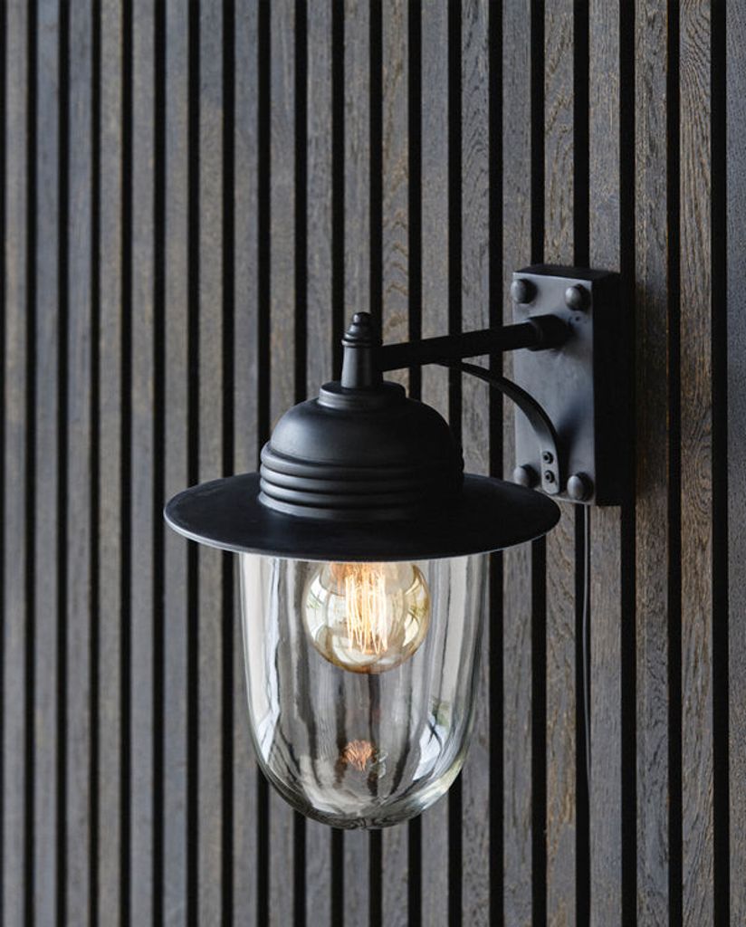 Elegant vägglampa för utomhusbruk i svart järn och klart glas. Perfekt för klassisk belysning.