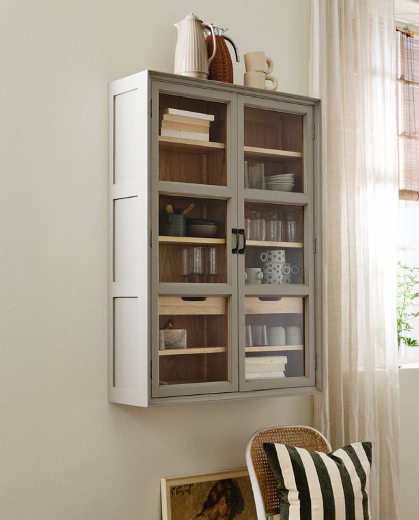 Stilrent väggskåp i gmelinaträ med grå finish, två glasdörrar och justerbara hyllor för flexibel förvaring.