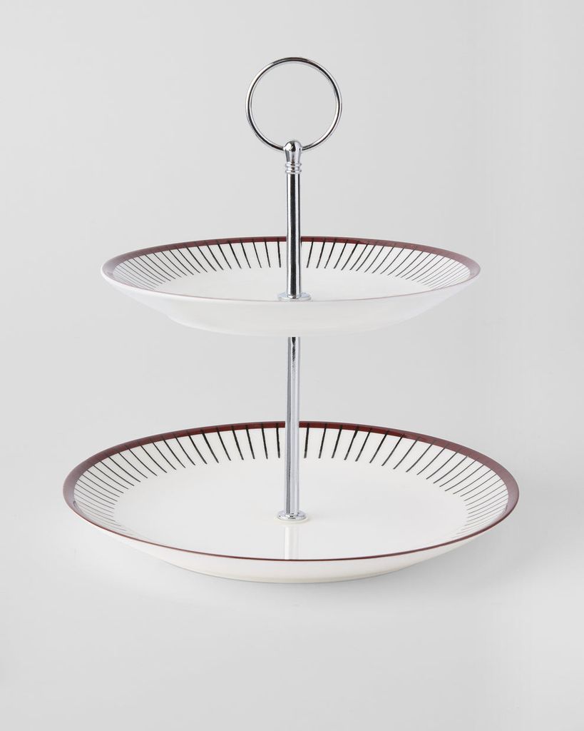 Detta 2-våningsfat erbjuder optimal serveringsyta utan att ta plats på bordet. Den avskalade designen utan bräm ger ett luftigt och elegant intryck, vilket lyfter fram det du serverar på ett smakfullt sätt. Det stabila metallstativet i mitten gör det enkelt att flytta fatet, samtidigt som det skapar en vertikal presentation som imponerar på gästerna. Passar perfekt för både vardagsfika och festligare tillfällen.