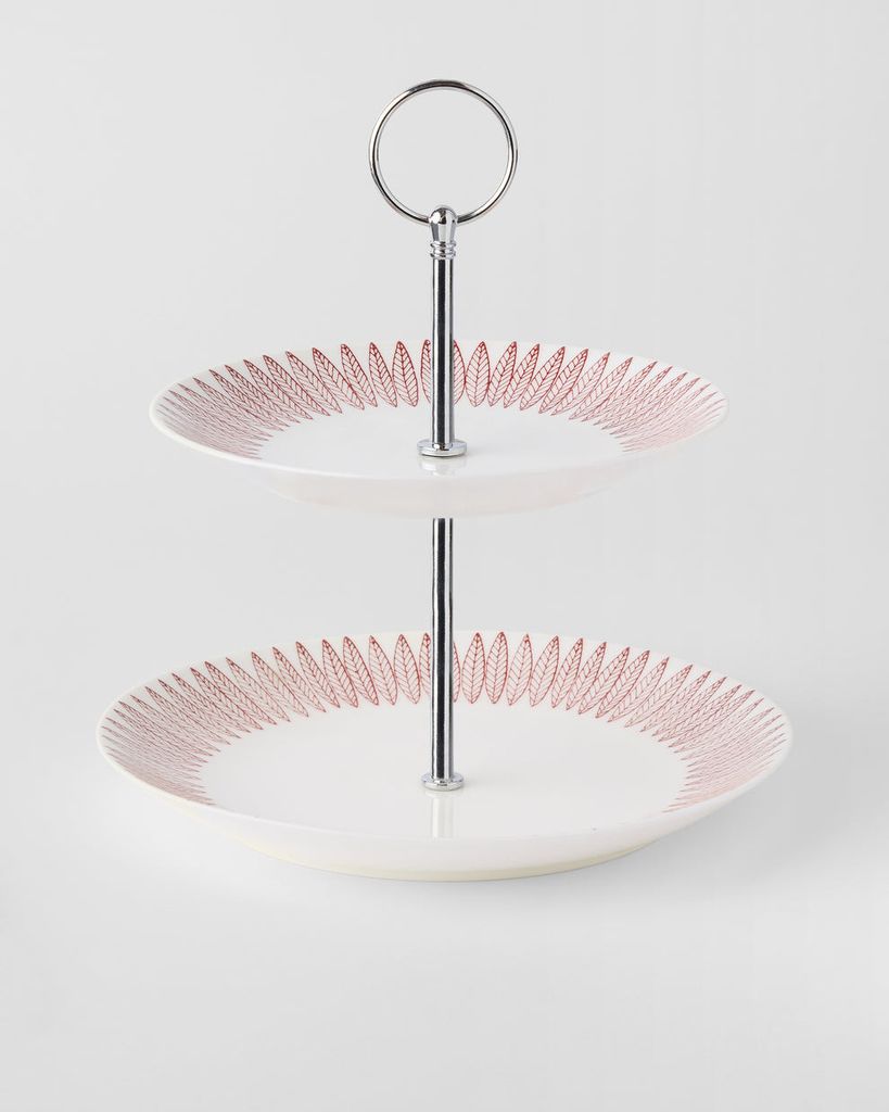 Gustavsberg SALIX RÖD Kakfat, 2-vånings utan bräm är ett blickfång på varje kaffebord. Med sin distinkta rödvita färgsättning och Stig Lindbergs ikoniska bladmotiv blir detta serveringsfat ett konstverk i sig. Den rena formen utan bräm ger ett modernt, avskalat uttryck, medan de två våningsplanen skapar höjd, elegans och funktion – perfekt för att presentera småkakor, frukt eller praliner på ett stilfullt sätt.