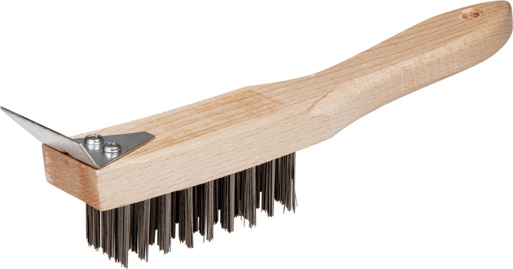Rejäl stålborste i trä med skrapa och ett bekvämt handtag. Ett lätthanterligt och smidigt verktyg som passar utmärkt som ett rengöringsverktyg inom det professionella köket.