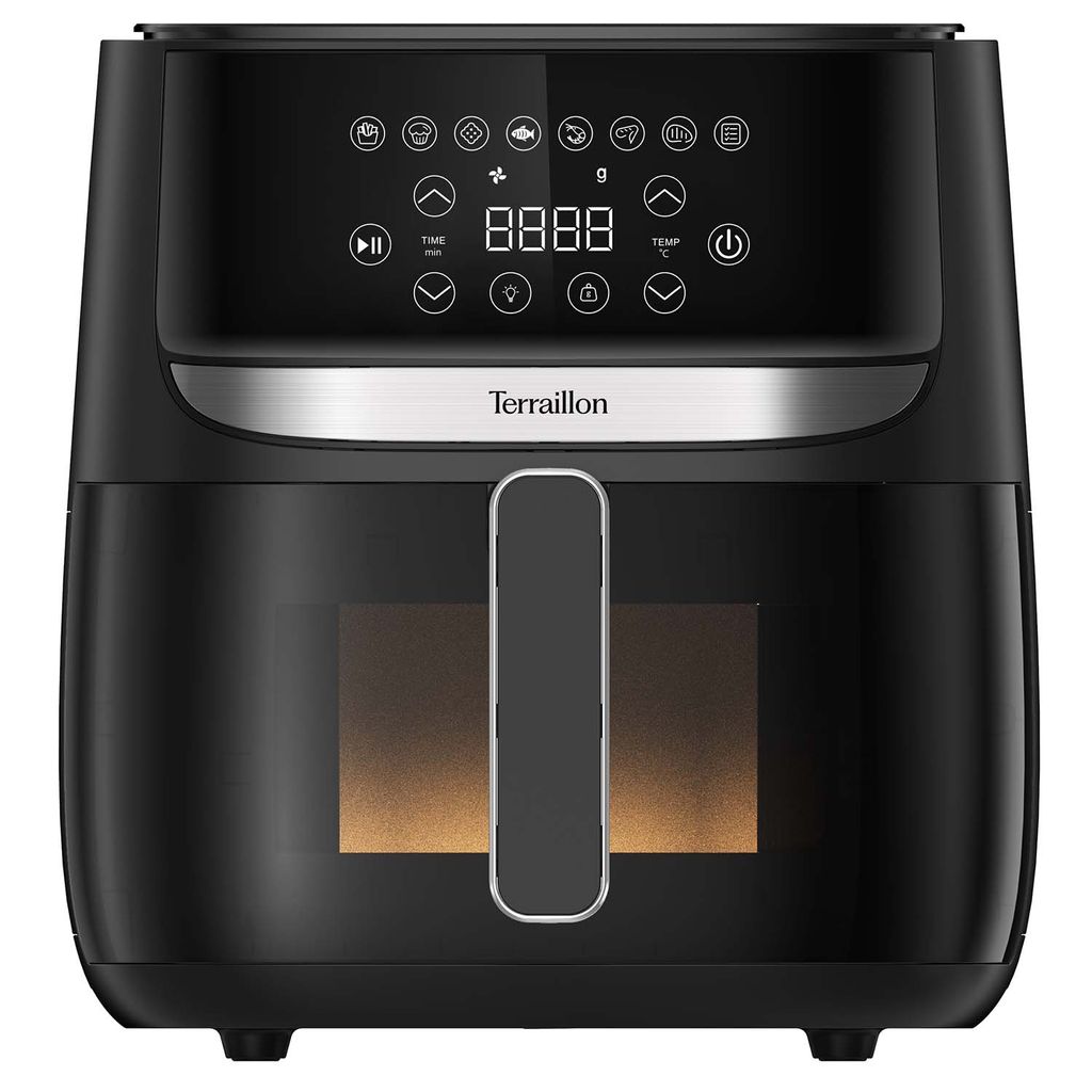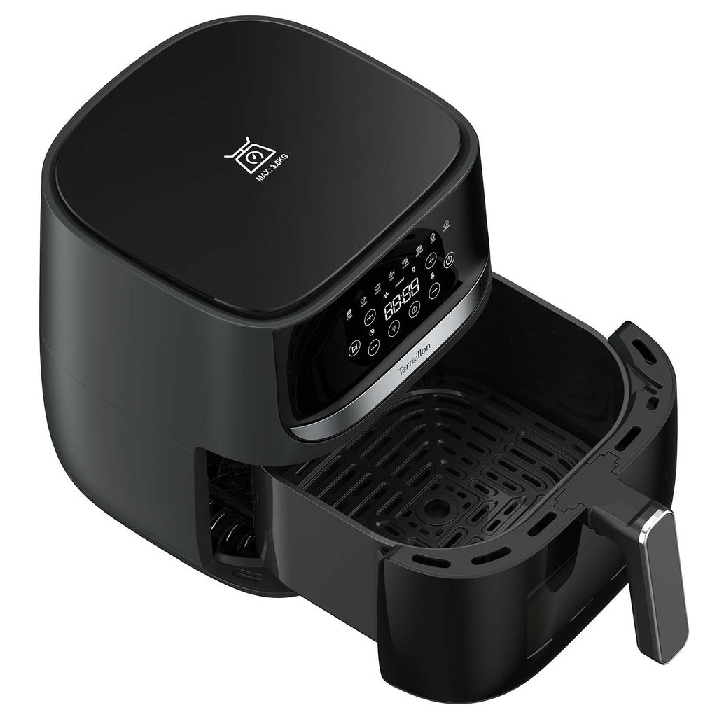 Upptäck Terraillon Air Fryer Smart Cook & Fry 2in1, din nya hjälpreda i köket. Med en elegant svart design och en kapacitet på 5,7 liter, anpassar den sig perfekt för familjemåltider. Den inbyggda vågen på 3 kg gör att du enkelt kan väga ingredienser direkt i apparaten.