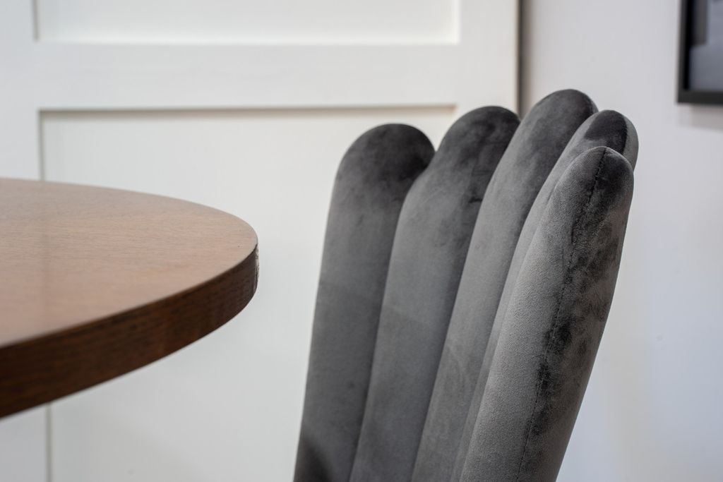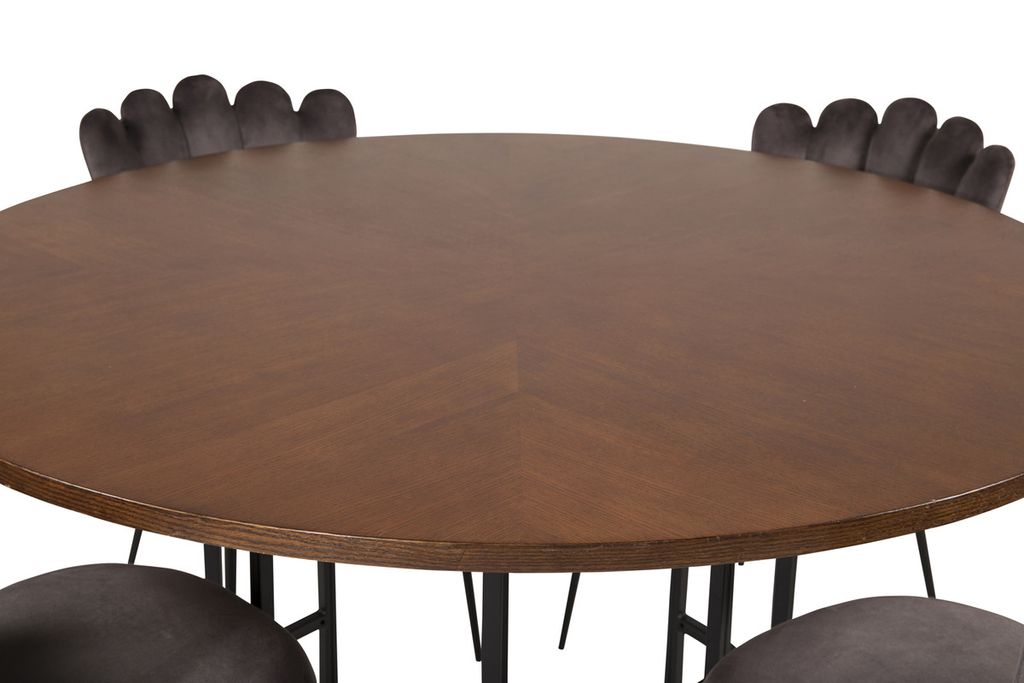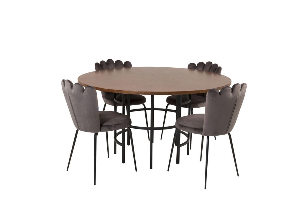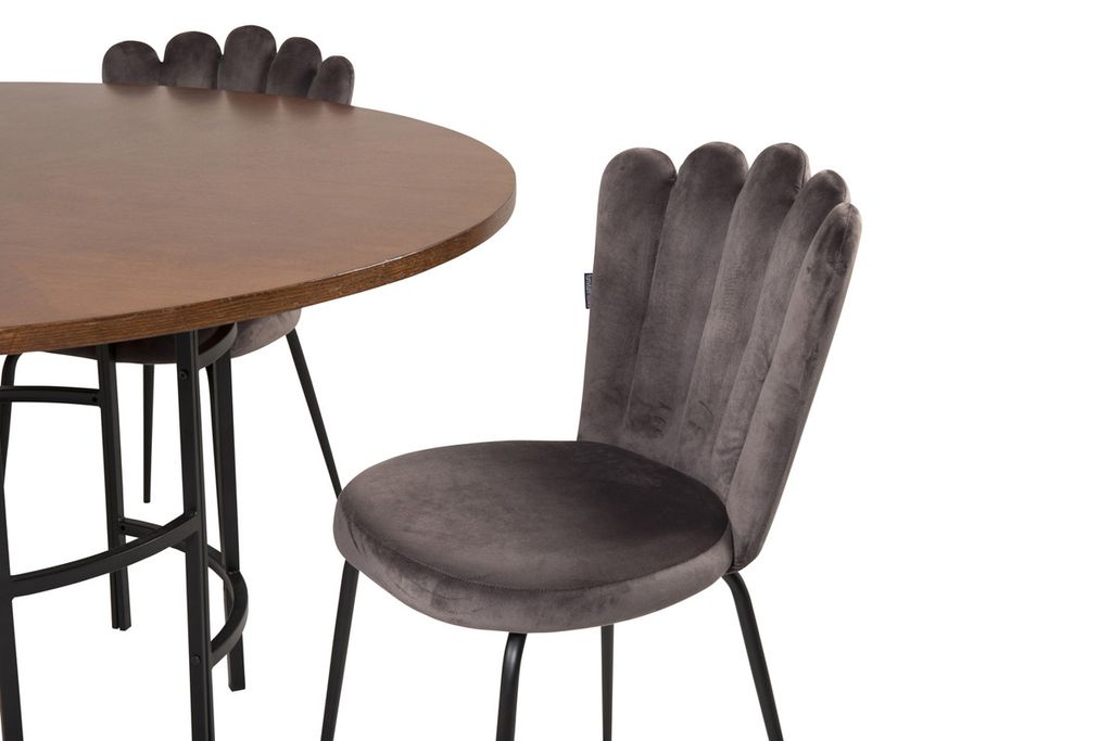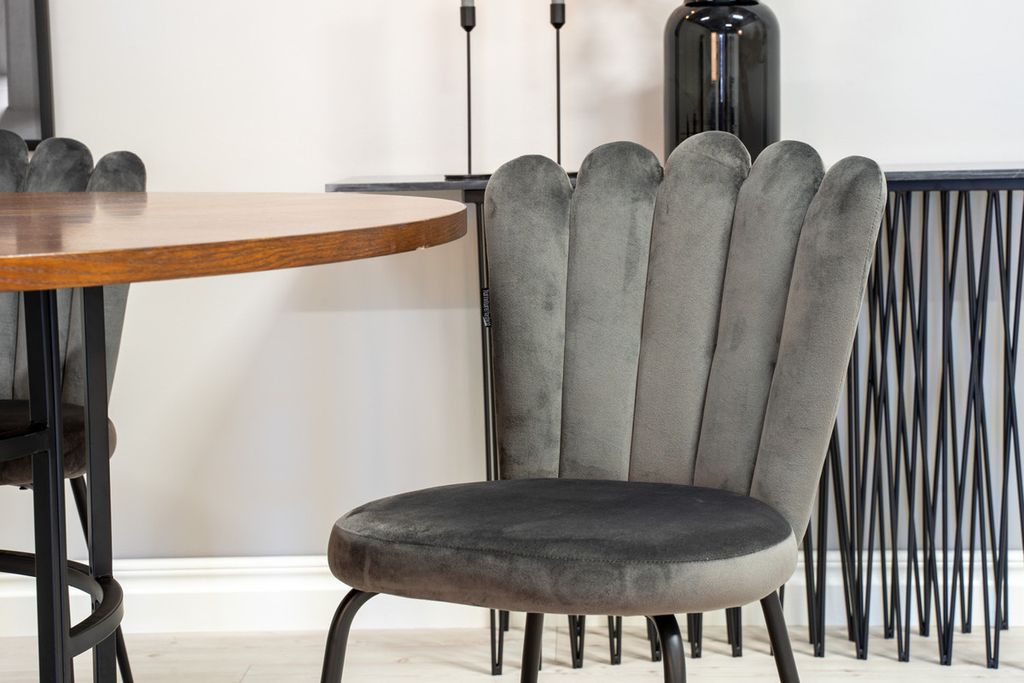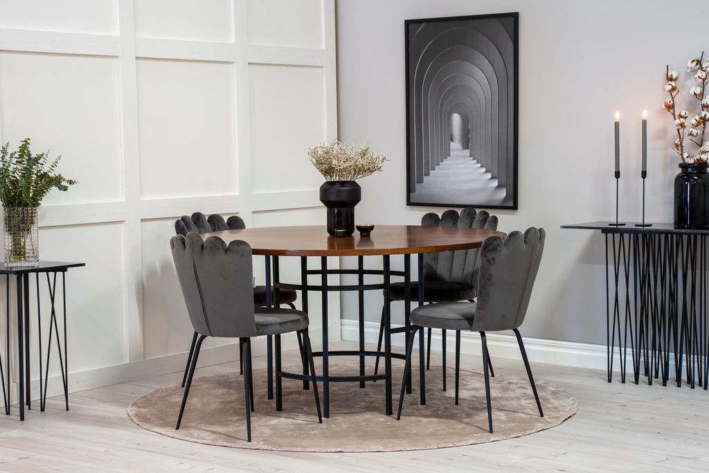 Rund matgrupp med härlig aura från kollektionen Furniture Fashion. Här blandas material och färger till en fantastisk kombination. Bord Copenhagen tillsammans med grå matstolar i serien Limhamn. Stolarnas unika ryggstöd ger matgruppen ett unikt uttryck.