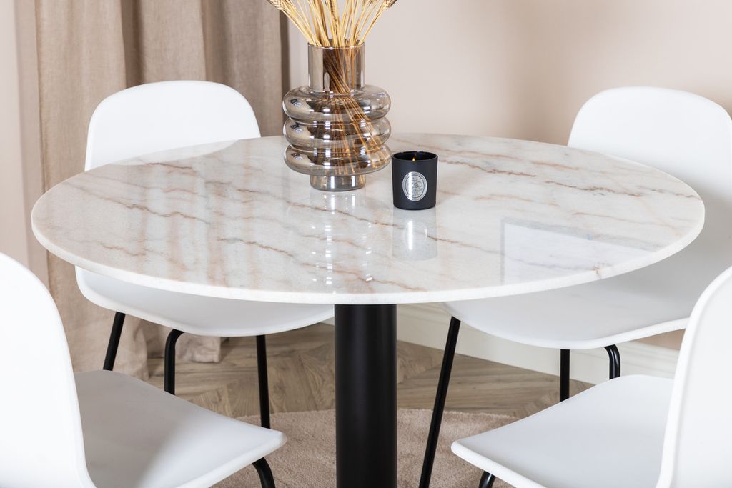 Vårt moderna marmorliknande matbord Estelle tillsammans med klassiska matstolar i serien Arctic. Här får du en matgrupp som direkt inger lyx och elegans.