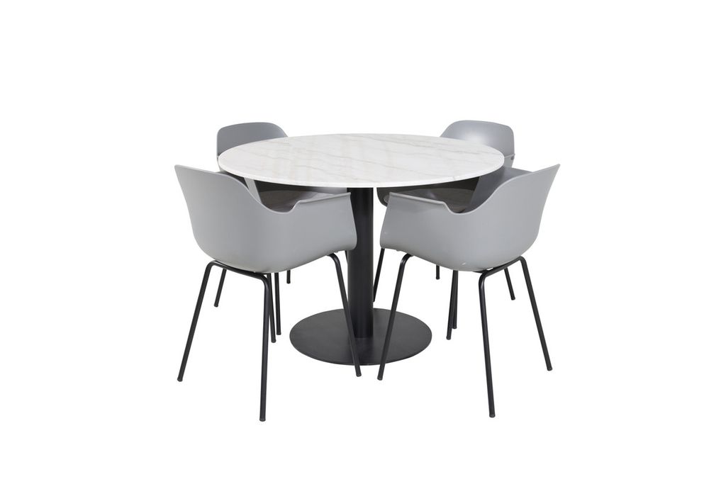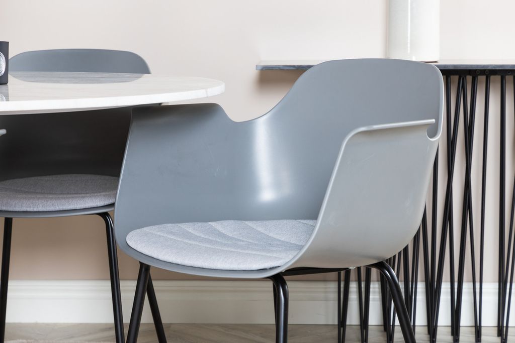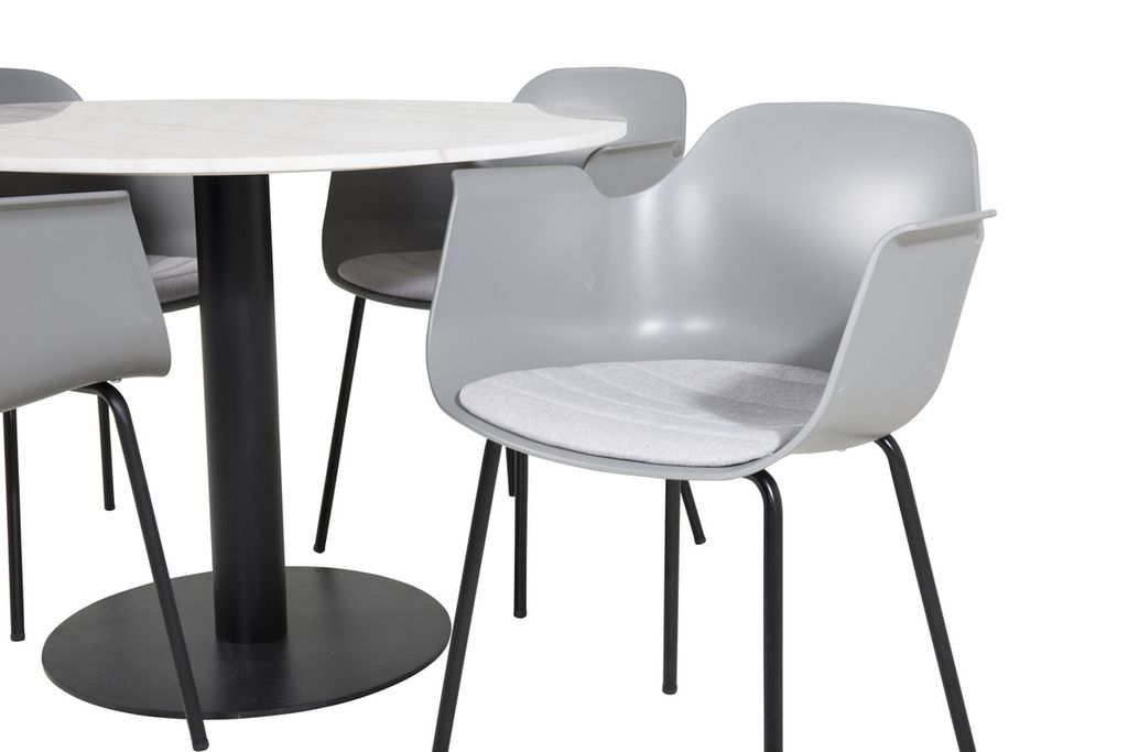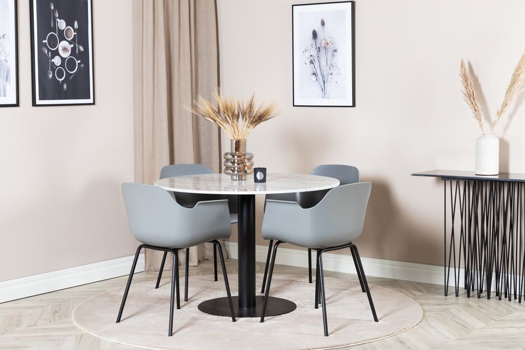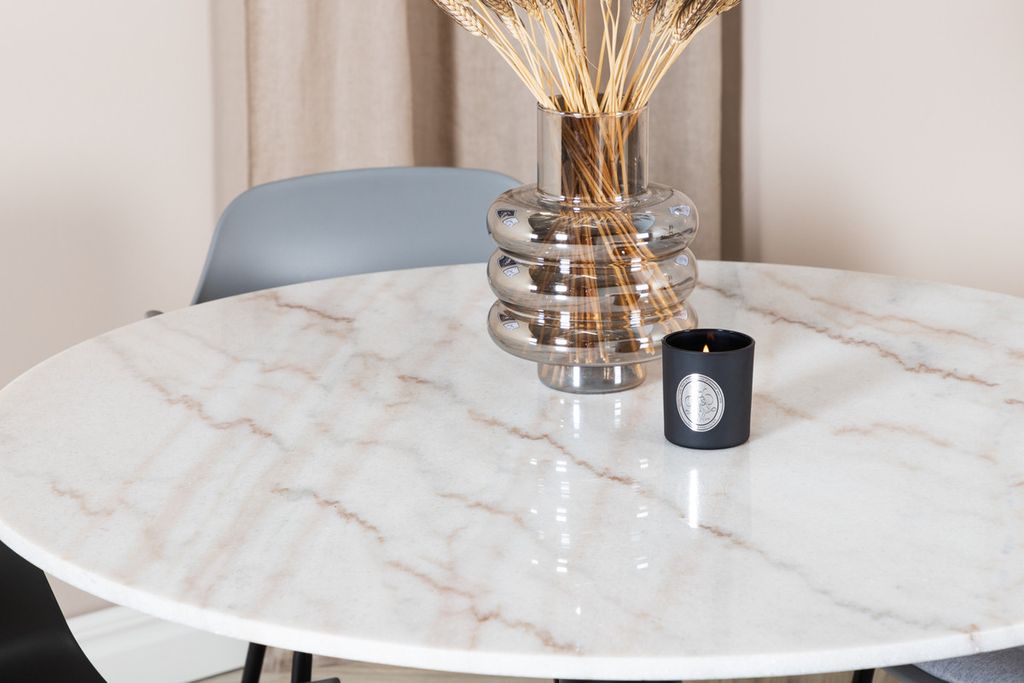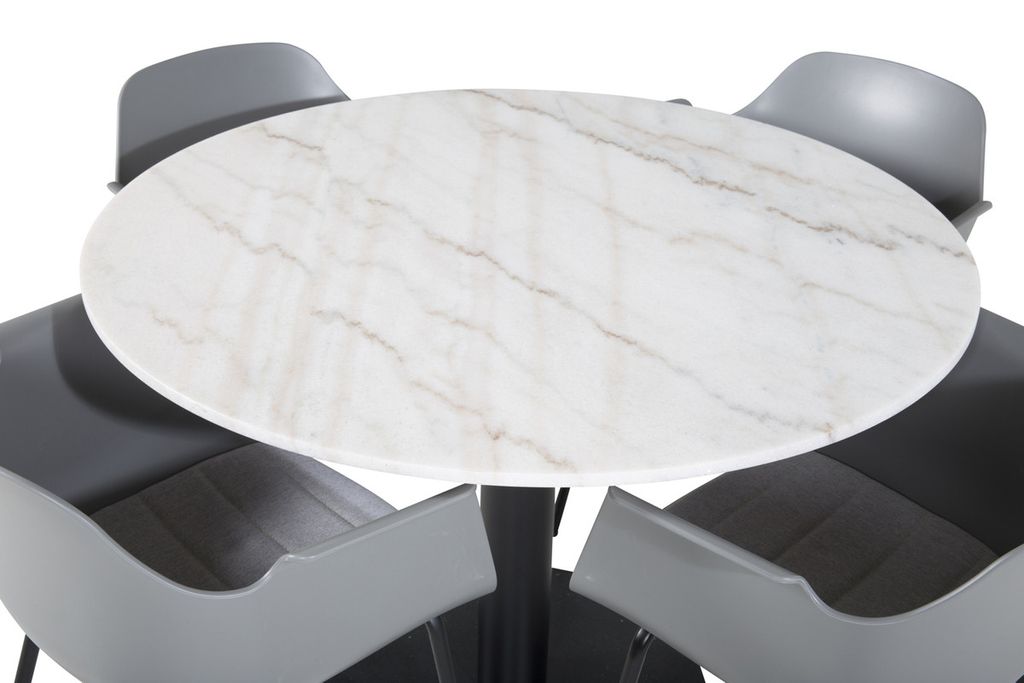 Det eleganta matbordet i marmor i serien Estelle kombineras här med karmstolar i serien Comfort i en trendig design. Matgruppen är som gjort för dig som vill skapa en ombonad och modern känsla i hemmet.