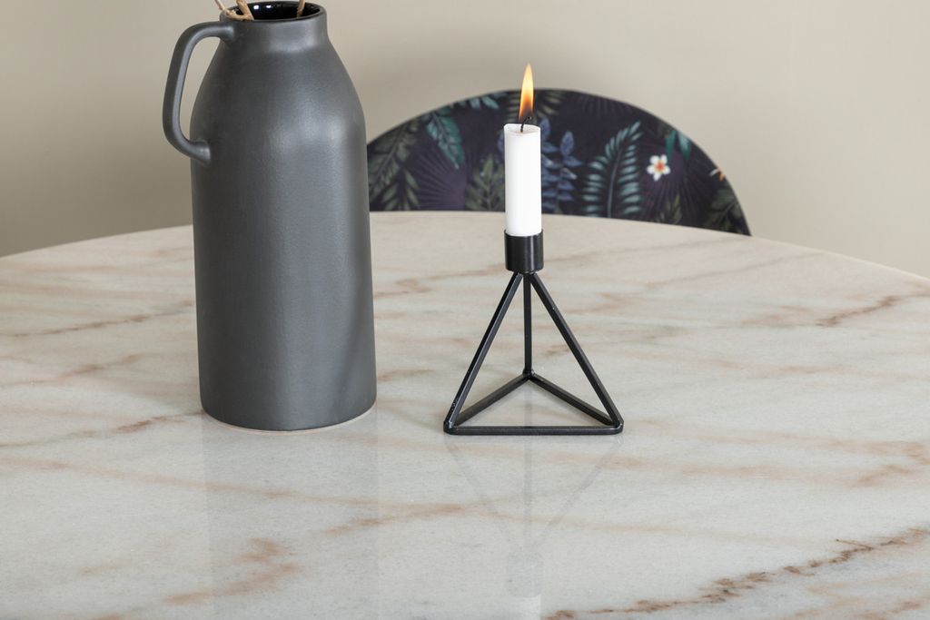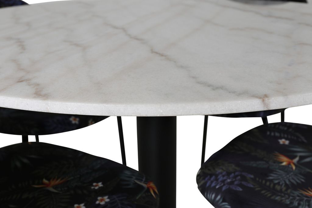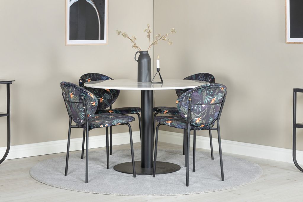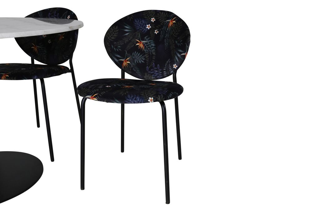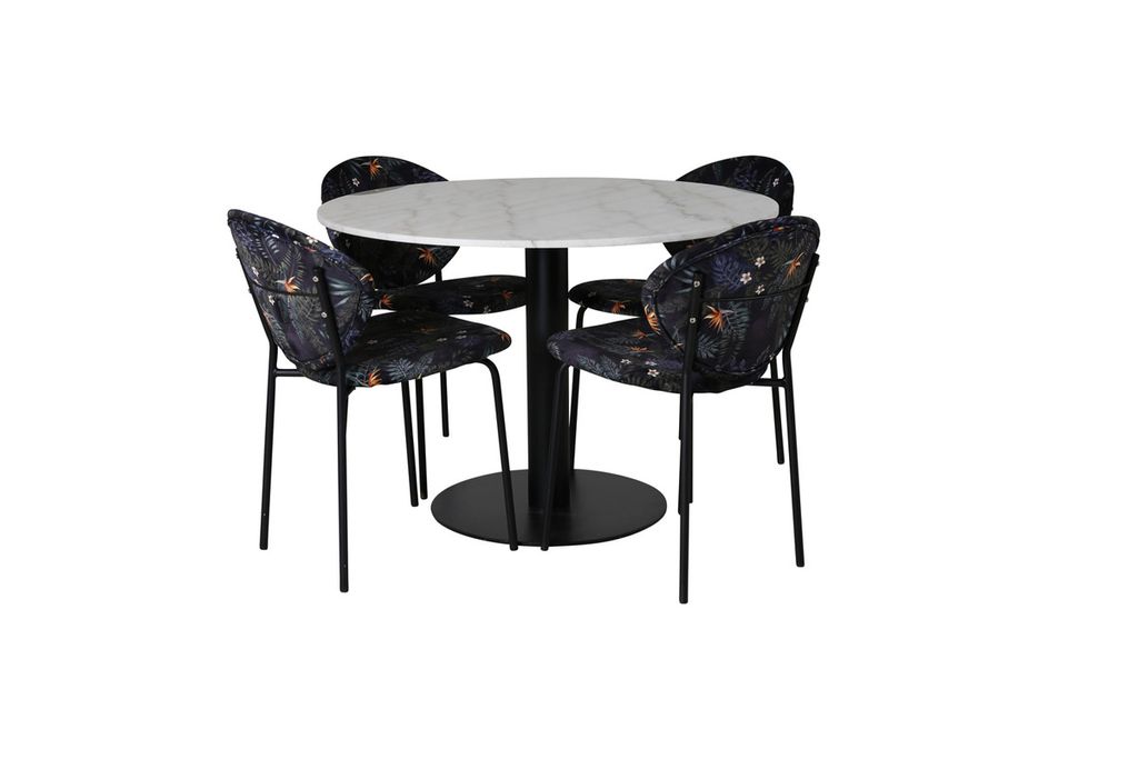 Vårt snygga matbord Estelle i en marmorlikande look tillsammans med våra svarta blommönstrande matstolar Valut. Låt hemmets hjärta präglas av din nya iögonfallande matgrupp.