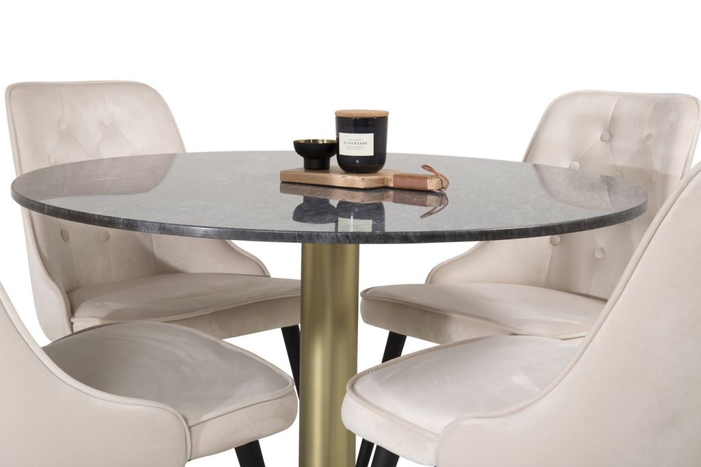 Matbord Estelle i en smäcker design, tillsammans med beige matstolar Velvet - den perfekta kombinationen för dig som vill ha en trendig matgrupp. Stolarnas höga sittkomfort bjuder in till långa och härliga stunder för umgänge!