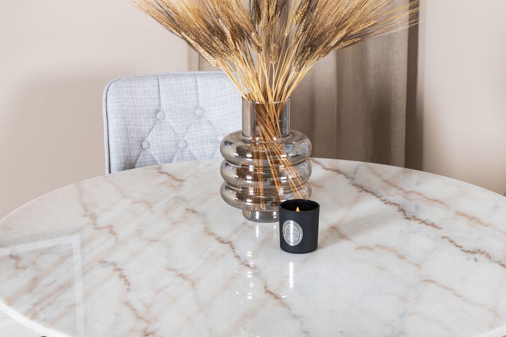 Matbord Estelle med en bordskiva i vacker marmor, tillsammans med de sköna stolarna i serien Velvet – här sitter du gärna kvar länge och njuter av goda vänners sällskap!