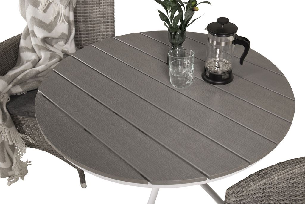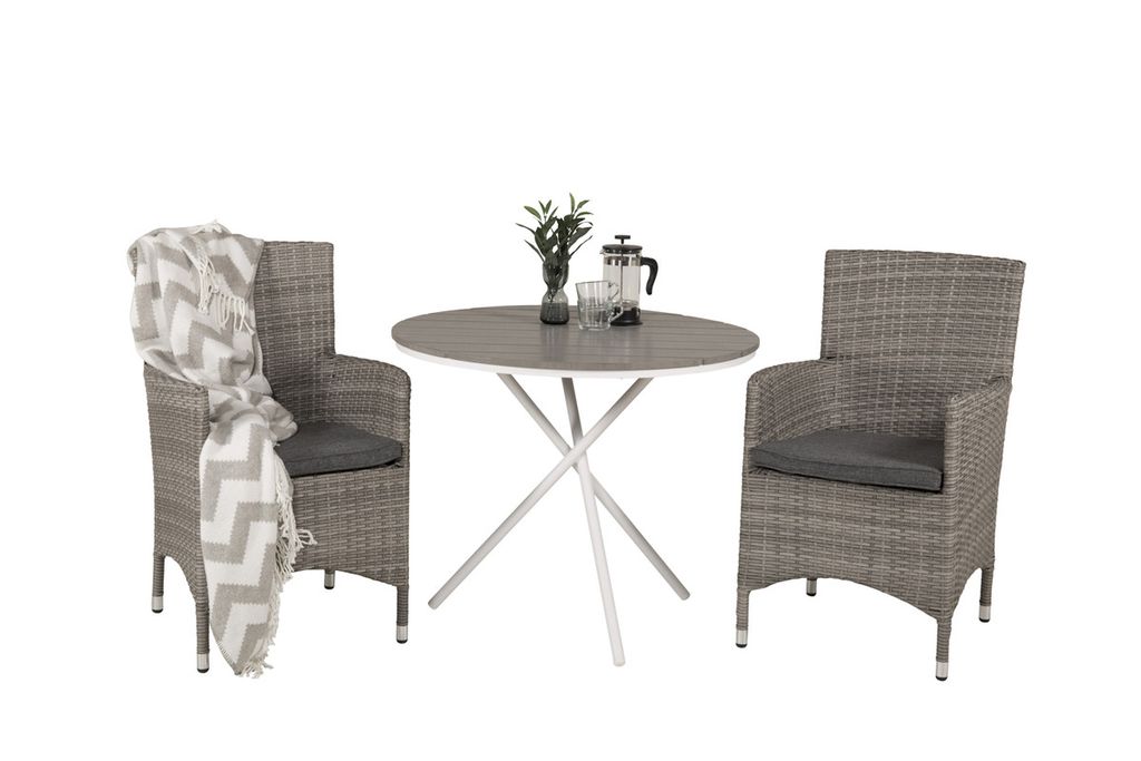 Duka ut eftermiddagsfikan och slå dig ner i den här stilsäkra och gemytliga matgruppen! Vårt mindre runda matbord Parma passar utmärkt till altanens soliga plats. Här tillsammans med robusta och bekväma matstolar i serien Malin.