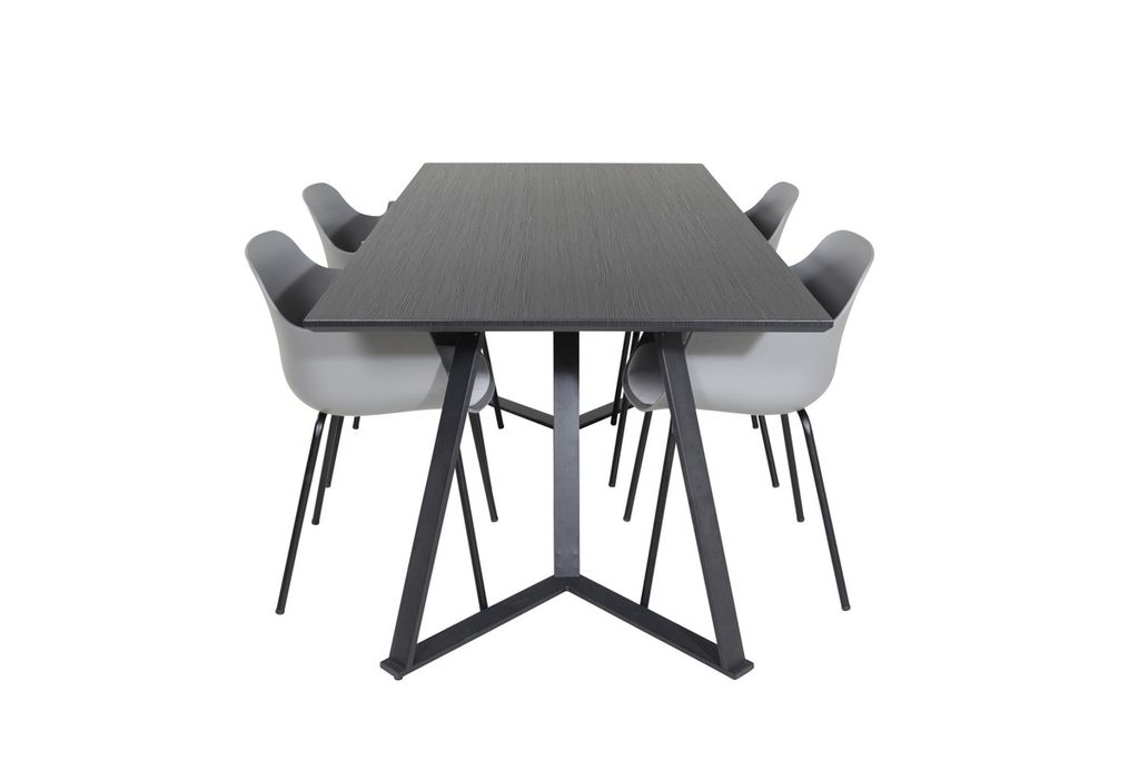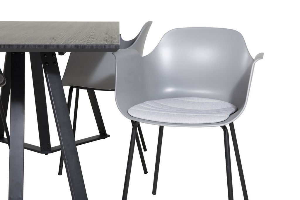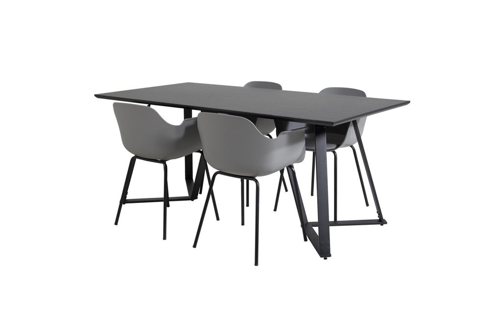 Stilrent matbord Marina med en bordsskiva i MDF och ett dekorativt underrede i metall kombineras här med karmstolar i serien Comfort i en trendig design. Låt hemmets hjärta präglas av din nya iögonfallande matgrupp!