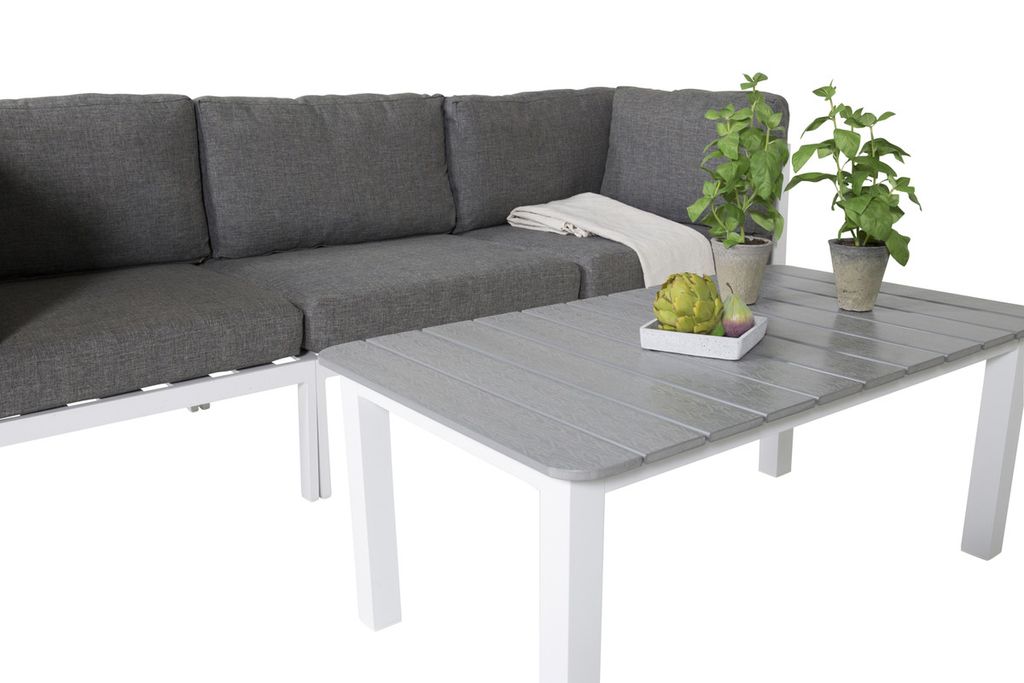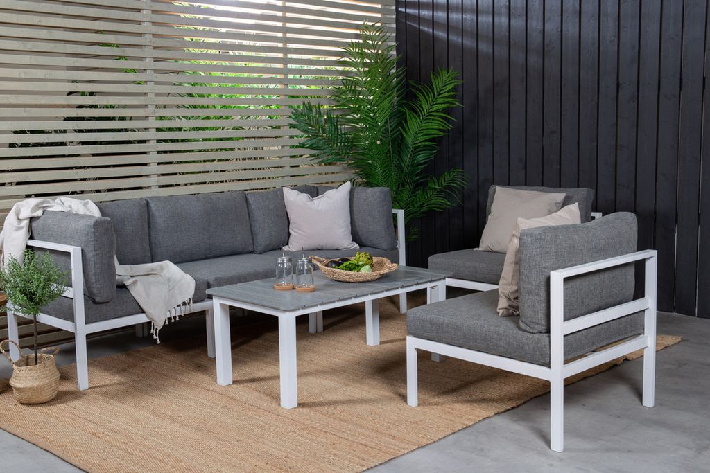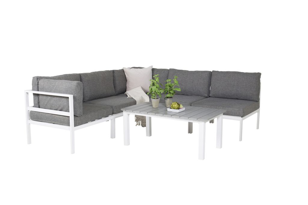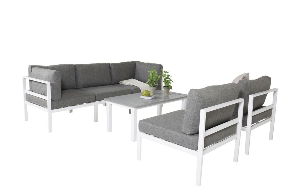 Soffgrupp i en rak, modern och stilren design som kommer passa perfekt till din uteplats. Soffgruppen består av en soffa som går att göra till en hörnsoffa, eller likt en soffa med två tillhörande fåtöljer. Till soffan medföljer ett sofbbord i serien Parma. Grå mjuka och väl tilltagna dynor ingår.