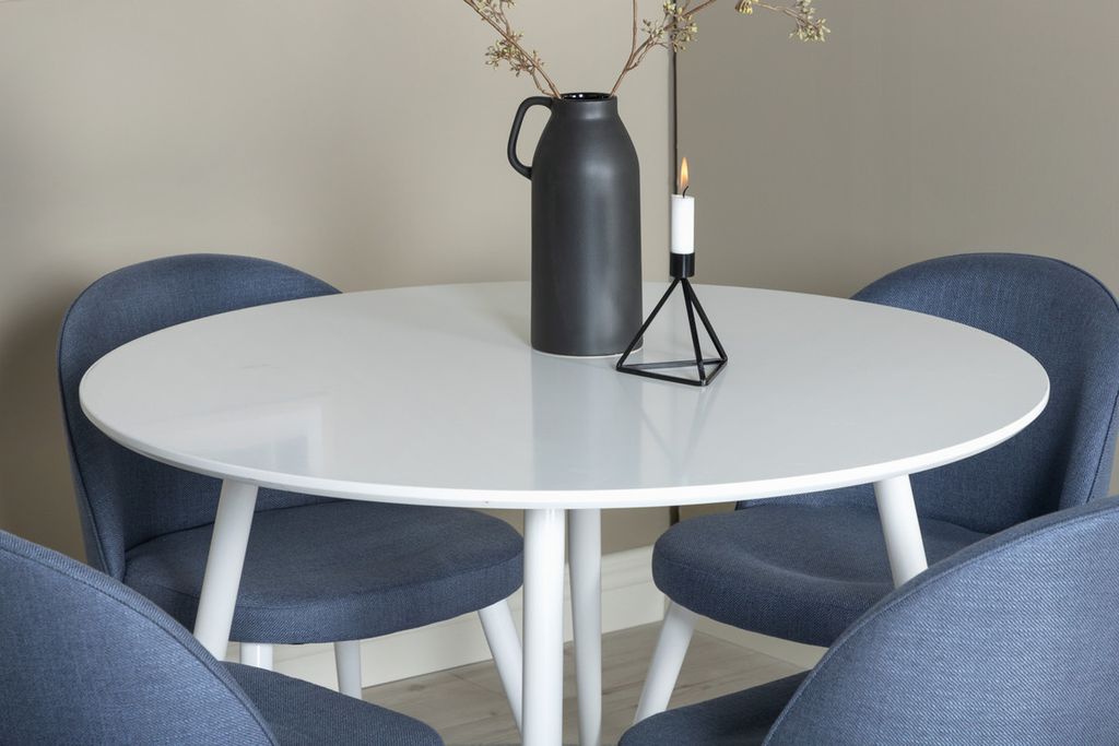 En mysig matgrupp med familjär känsla! Matbord Plaza i snygg vit finish kombineras med bekväma matstolar i serien Velvet. Låt den här vackert matchade matgruppen med modern känsla bli en naturlig samlingsplats i ditt hem.