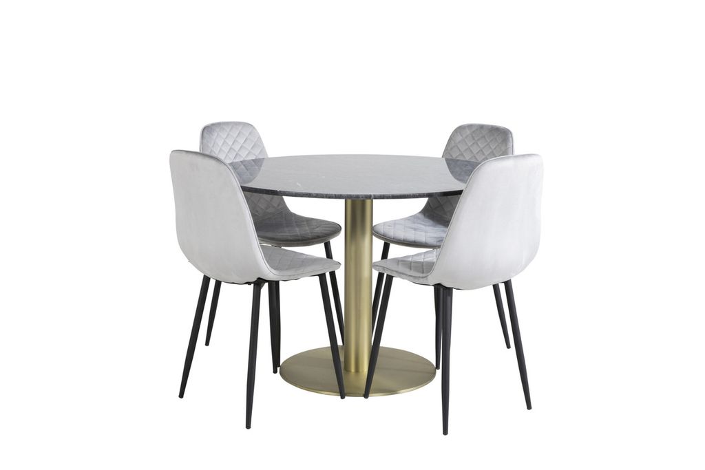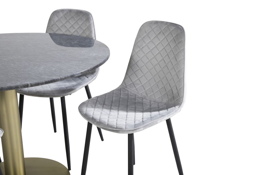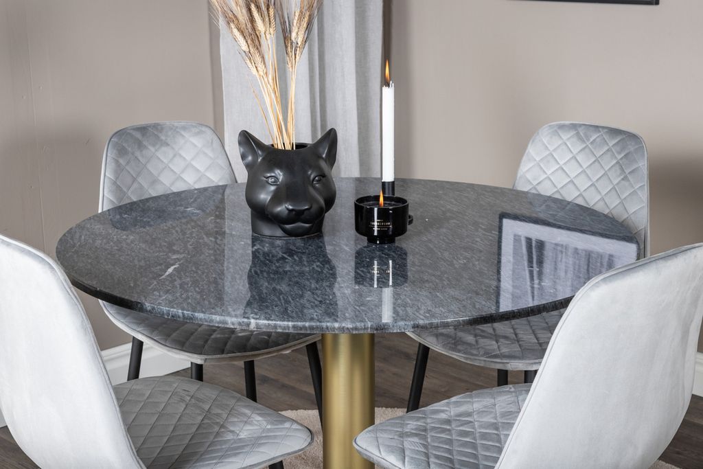 Det eleganta matbordet i vacker marmor i serien Estelle tillsammans med snygga matstolar i serien Polar - en matgrupp som bjuder in till många härliga sociala stunder.