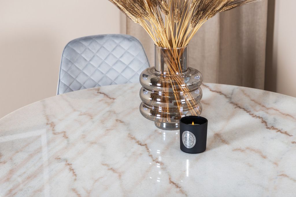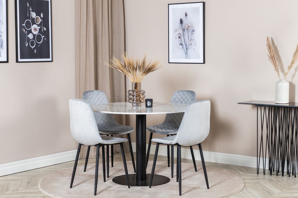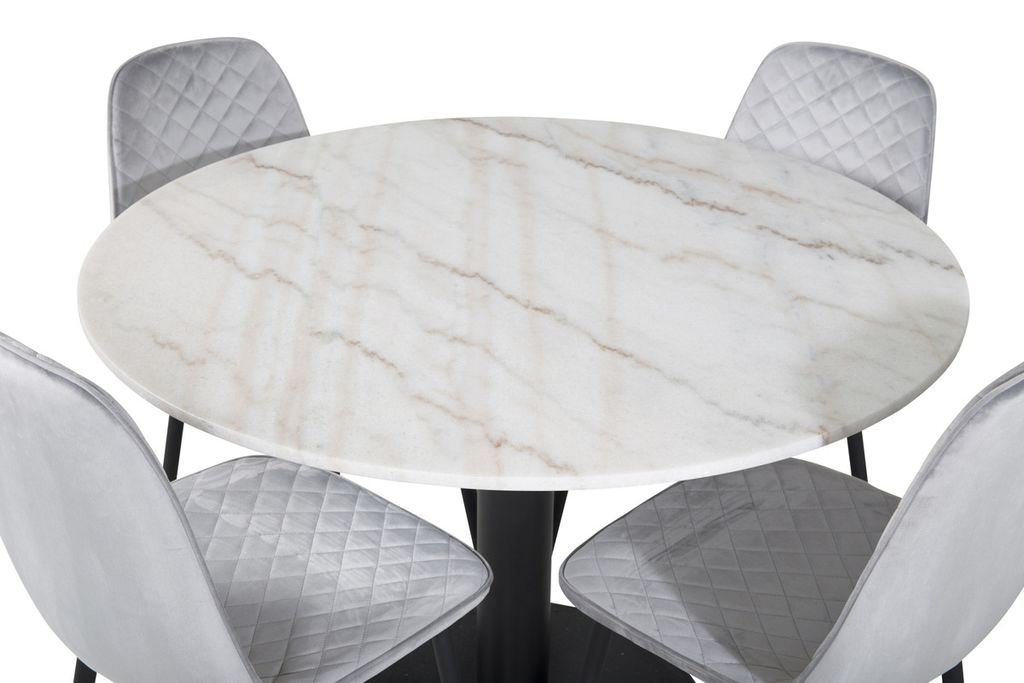 Det eleganta matbordet i vacker marmor i serien Estelle tillsammans med snygga matstolar i serien Polar - en matgrupp som inger lyx och bjuder in till många härliga sociala stunder.