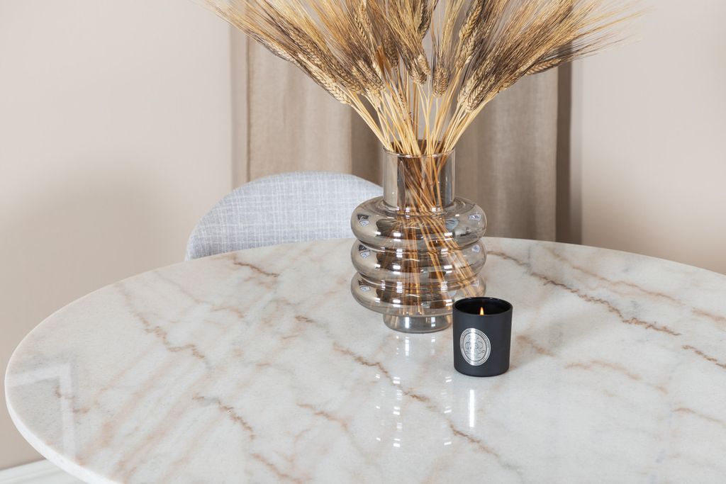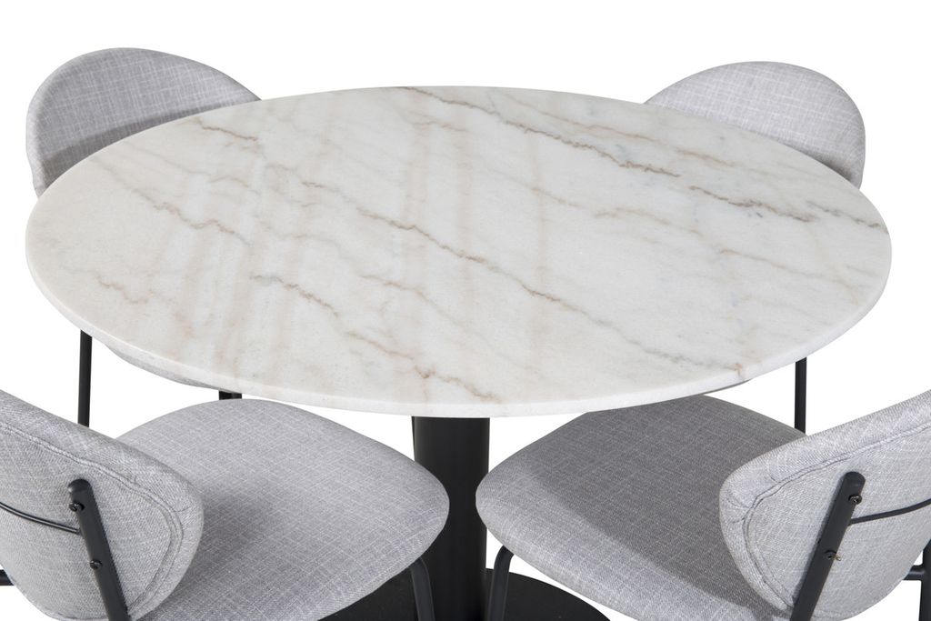 Matbord Estelle i en läcker design med bordsskiva i marmor, tillsammans med de stilfulla grå matstolarna Vault – en matgrupp att längta hem till!