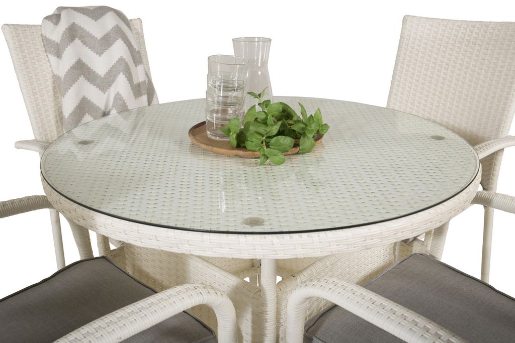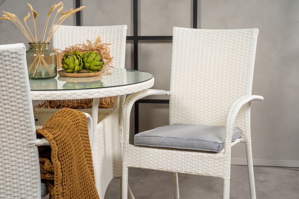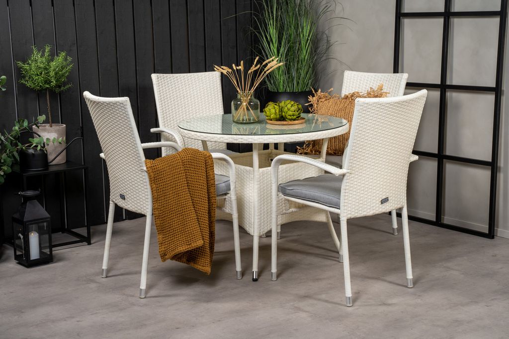 Vårt moderna matbord Volta tillsammans med bekväma matstolar i serien Anna. Här får du en matgrupp som direkt inger lyx och elegans. ”Klä upp eller ner” din uteplats eller altan med övrig inredning runt om, lika bra till vardags som till fest!