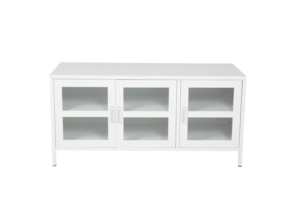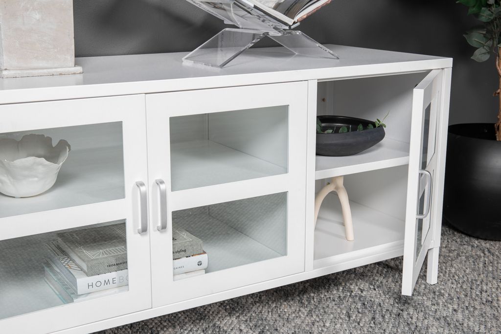 Venture Home Acero Förvaring är en elegant och funktionell möbel som kombinerar modern industridesign med stilren estetik. Tillverkad i pulverlackerad vitt stål, erbjuder den inte bara hållbarhet utan också en tidlös look som passar alla hem. De tre dörrarna i klarglas ger en öppen och ljus känsla, vilket gör det enkelt att visa upp dina favoritsaker.