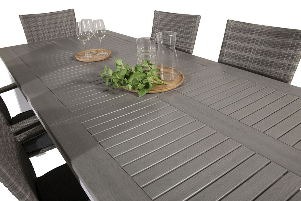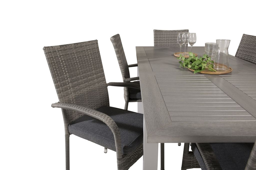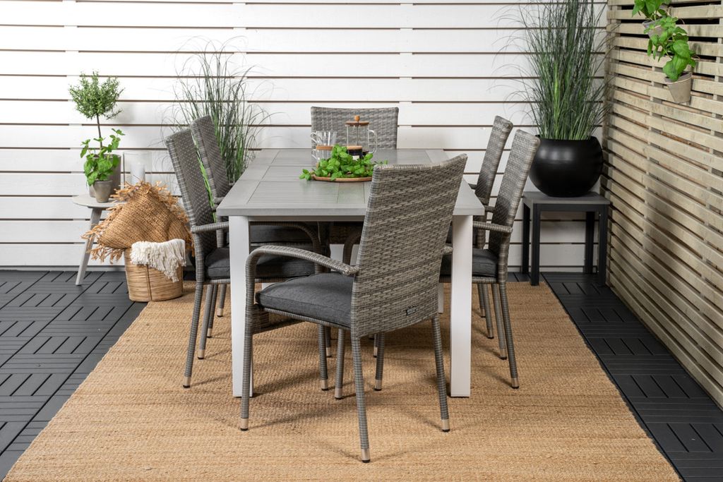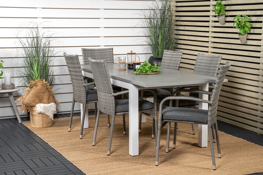 Matgrupp som passar i de flesta miljöer! Vårt förlängningsbara matbord Albany tillsammans med snygga stolar i serien Anna i grå konstrottning är som gjort för dig som vill skapa en ombonad och modern känsla i trädgården eller i uterummet. Utöka dina middagsbjudningar och slipp oroa dig över att alla ska få plats.